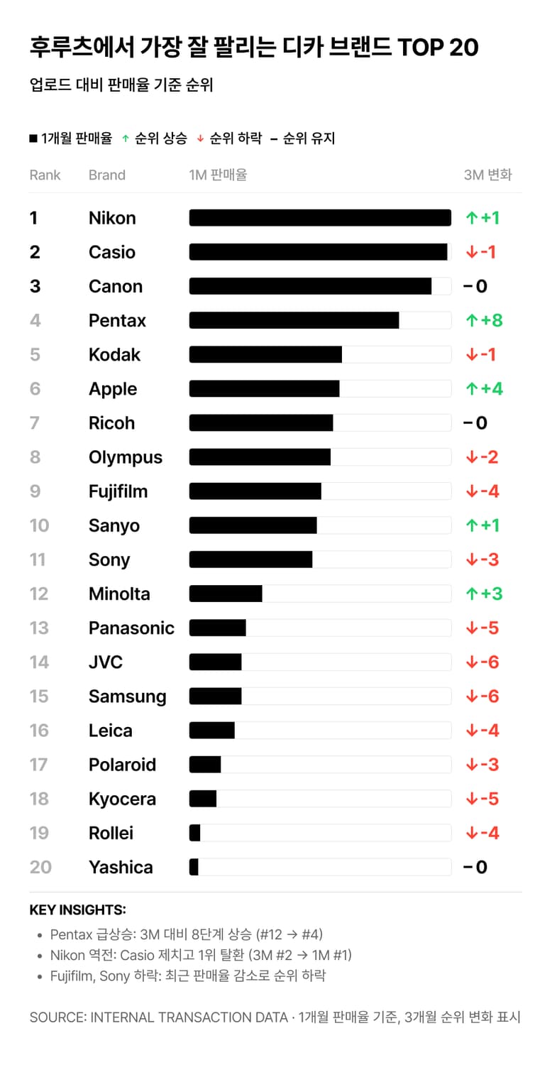 유행을 넘어서 하나의 문화로 거듭난 디지털 카메라. 스펙이나 해상도보다 중요한 것은 마음을 움직이는 ‘감성’이죠. 조금은 흐릿하고 투박한 화면 너머에서 오히려 더 따뜻한 장면들이 담기기 때문에, 디지털 카메라는 이제 하나의 취향이자 일상을 기록하는 새로운 방식으로 자리잡았습니다. 가장 많이 거래되는 디지털 카메라 브랜드는 과연 무엇일까요? 최근엔 추억 속에 있던 브랜드들이 다시 주목을 받고, 예상 밖의 이름들이 상위권에 오르며 흥미로운 흐름을 보여주고 있습니다. 가장 인기 있는 디지털 카메라를 지금 확인해보세요!