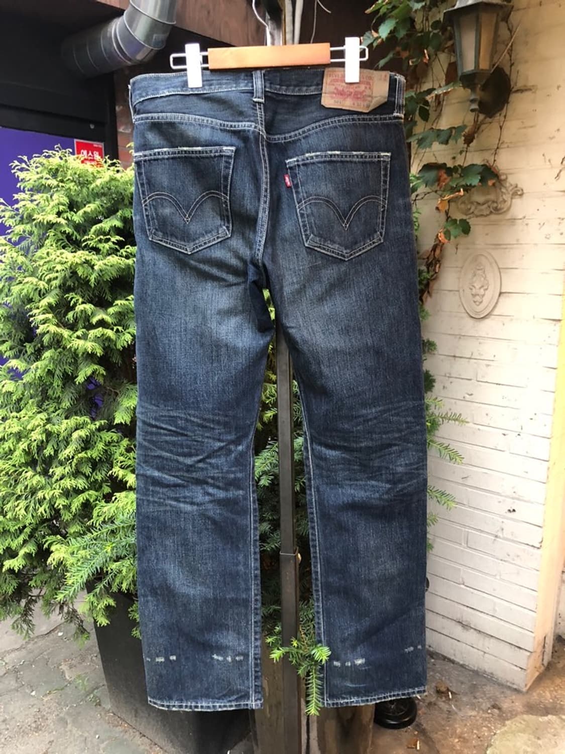 기무라타쿠야 데님으로 유명한 리바이스 501 모델입니다. 인위적인 워싱이지만 나름 멋스러운 제품으로 국내 32 사이즈입니다. 택 표기 사이즈 32x32 허리 42.5 밑위 30 허벅지 29 밑단 21 총장 108