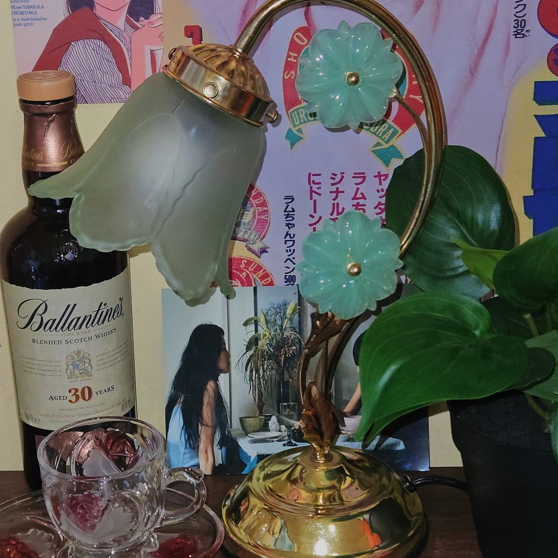 일본에서 80-90년도 제작되었던 특유의 레트로 감성이 느껴지는 테이블 조명 불투명 글라스 소재로 제작된 꽃잎 쉐이드, 묵직한 골드 바디에 2개의 그린 꽃잎 장식, 입체적인 잎사귀 장식까지 볼수록 고급스러워요. 지금은 만나보기 힘든 아이로 특유의 레트로 감성을 좋아하신다면 정말 추천드리며, 긴 높이와 색상 포인트로 어디든지 올려만 두셔도 예쁘답니다. 국내 사용을 위해서 안전하고, 편리한 핸들 스위치를 작업 후에 출고 예정 평일 2~3일 (220v 변환기o, 기본 전구e17 포함) 골드 바디의 자연스러운 세월감을 제외하면 정말 좋은 상태 유지중 size: 갓지름13cm x 가로27cm x 높이36cm