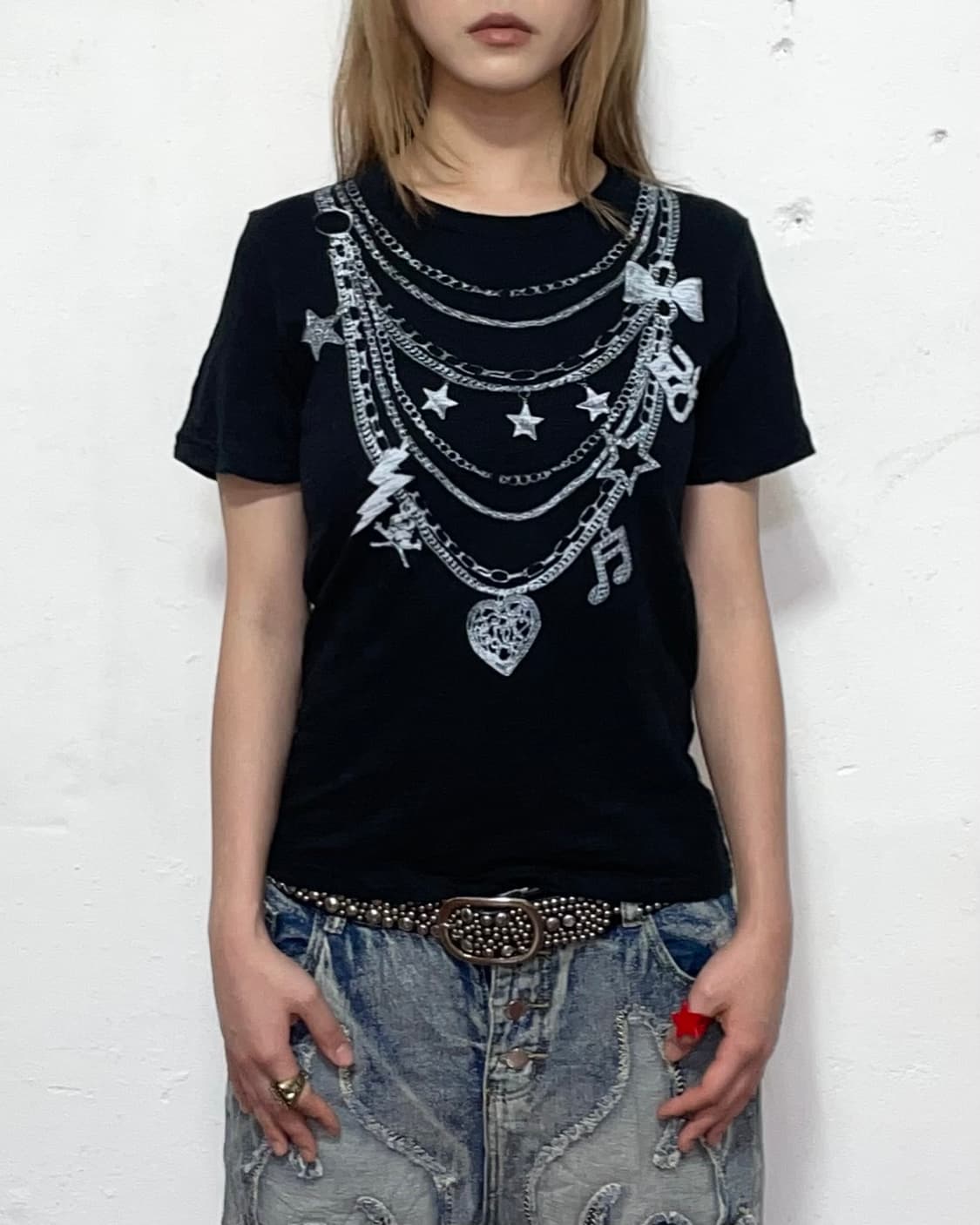 <제품설명> Japanness vtg "S*H*C"사의 Trompe-l'oeil Necklace Fake T-shirt39000 제품입니다. 전면부 트롱프뢰유 목걸이 프린팅이 매력적인 제품이며, 후면부에는 레터링이 존재합니다. 레귤러 핏으로 남녀노소 착용가능합니다! <measurement> shoulder : 39 chest : 43 sleeve : 18 length : 54 (cm) <Price> ₩39,000 -No Refund No Exchange- contact DM * 빈티지 제품 특성상 약간의 사용감 및 오염이 존재할수 있습니다*