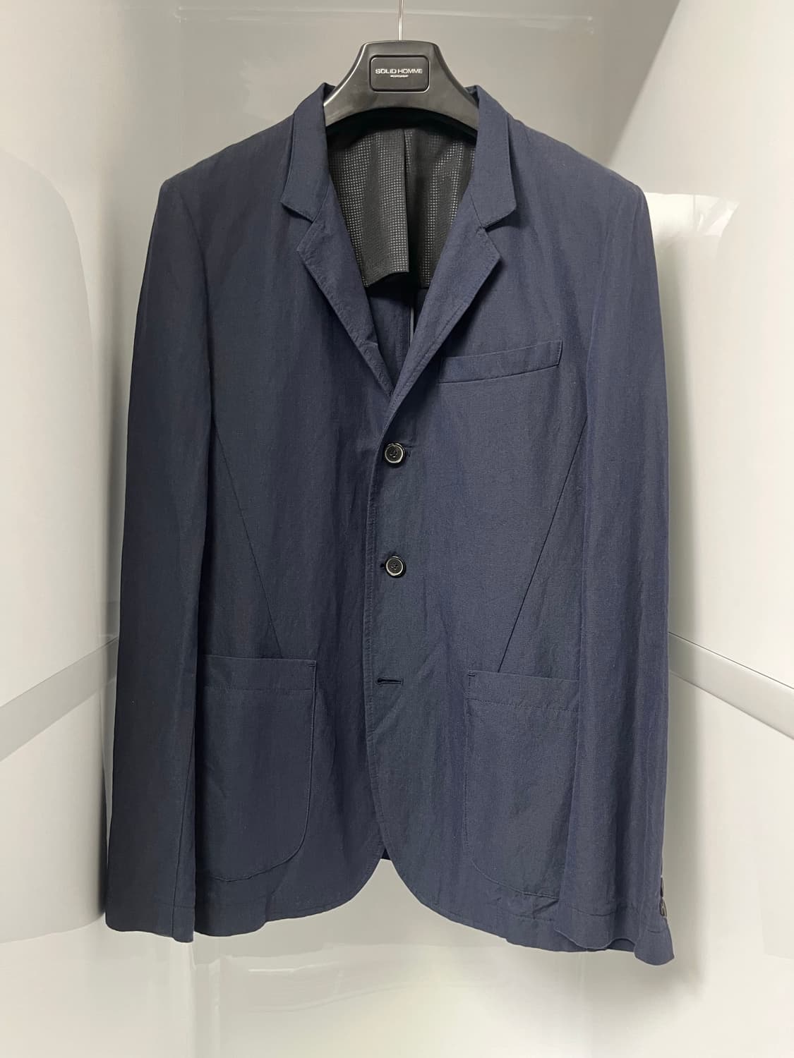 솔리드옴므 자켓입니다. •정품, 새상품 •사이즈 : 100 사이즈 (48 사이즈) •색상 : 네이비 (500N) •섬유혼용률 : 면35%, 폴리35%, 레이온30% •쓰리버튼 •노치드 라펠 •리얼 버튼 •싱글 벤트 •아울렛 구매. •의미없는 리테일가 : 628,000원. •네고는 하지 않습니다.•