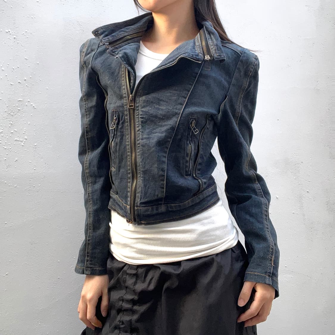 Size : 가슴 34 총장 47 팔 57 빈티지한 데님 원단의 하이넥 자켓 다양하게 연출가능한 유틸리티 디자인 사진과 같이 양호한 상태 유지중 상점 공지 숙지 후 구매하실분만 연락주세요 #vintage #japanesevintage