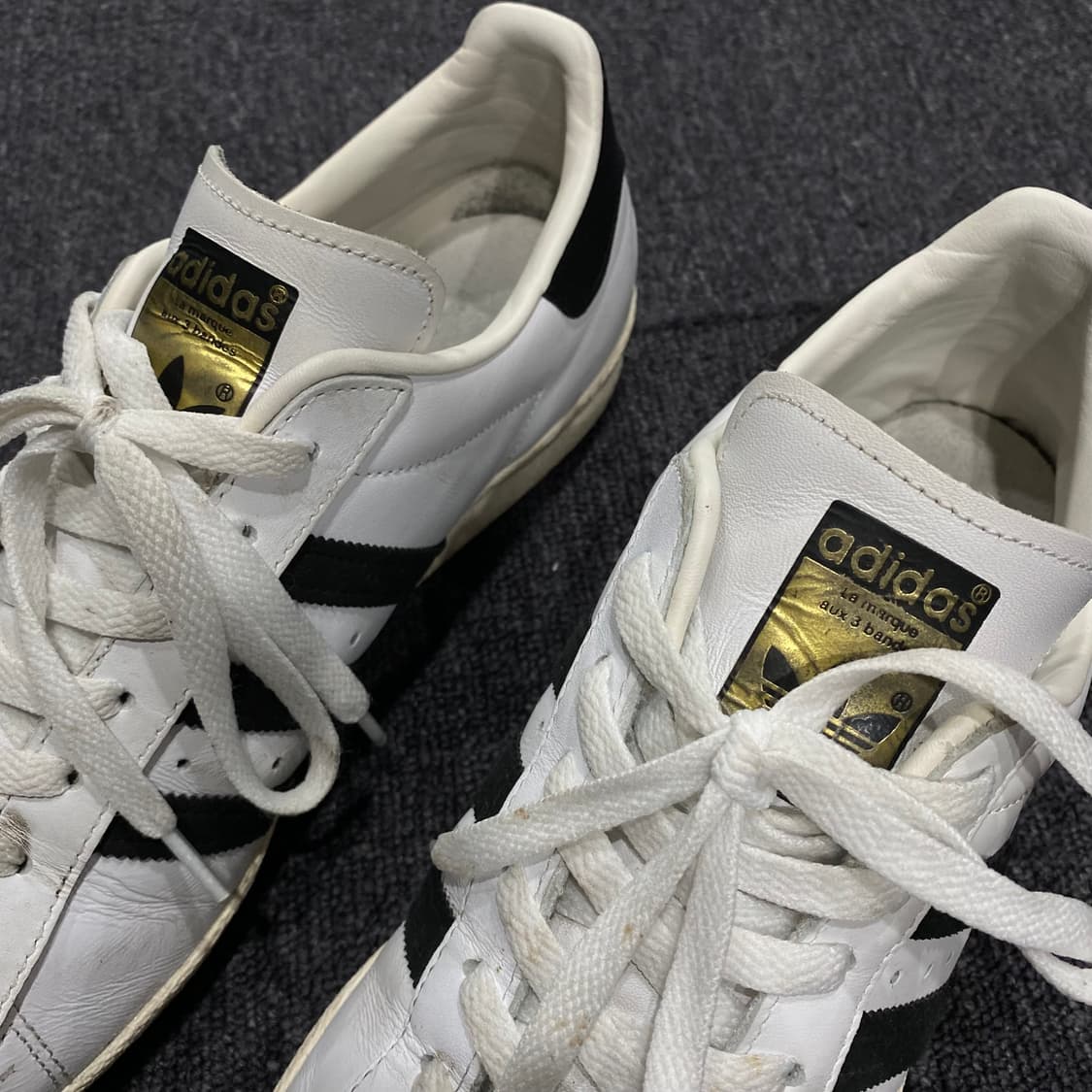 아디다스 슈퍼스타의 오리지널인 80’s제품을 복각한 제품입니다. 파운데이션제품과는 다른점은 앞코에 빈티지 스러운 변색과 얇은 혓바닥을 보여주는 다른점을 보여주고 있습니다! 사이즈 285
