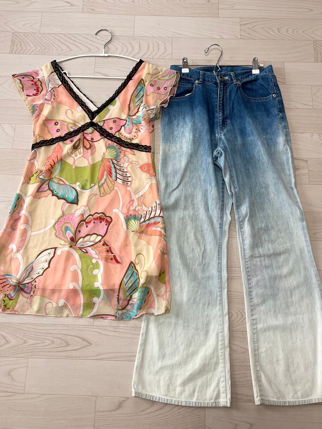 ⚠️재고 확인이 필요해서 구매전에 꼭 문의 부탁드립니다🙇🏻‍♀️ *개인 사정으로 인해 11일 밤에 발송합니다. 불편을 드려 죄송합니다만 양해해 주시기 바랍니다. 사이즈 (cm) 나비 미디 원피스 총장: 77 그라데이션 데님 허리: 33 총장: 97 본 페이지는 상기 2아이템 세트가격입니다. 단품 구매 원하시는 분은 편히 문의 주세요🫶