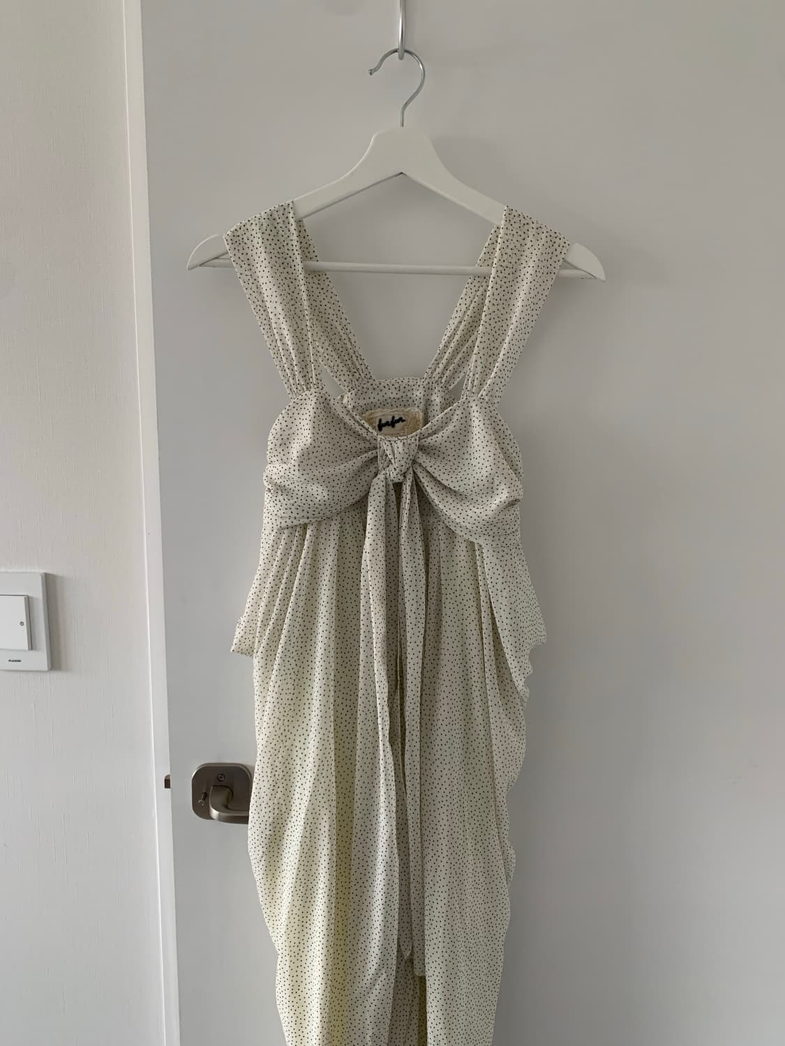 * condition A * size(cm) 총장 108 / 가슴단면 52 * 폴리에스테르 100% ◛⁺⑅ 양옆으로 드레이프되는 실루엣이 아름다워요. 가슴 리본은 귀엽기까지! 도트 아이보리 원단에 연노랑빛 안감 여행룩으로 추천하지만 가디건이나 자켓을 걸쳐주면 충분히 일상룩으로도 활용가능하답니다🌼