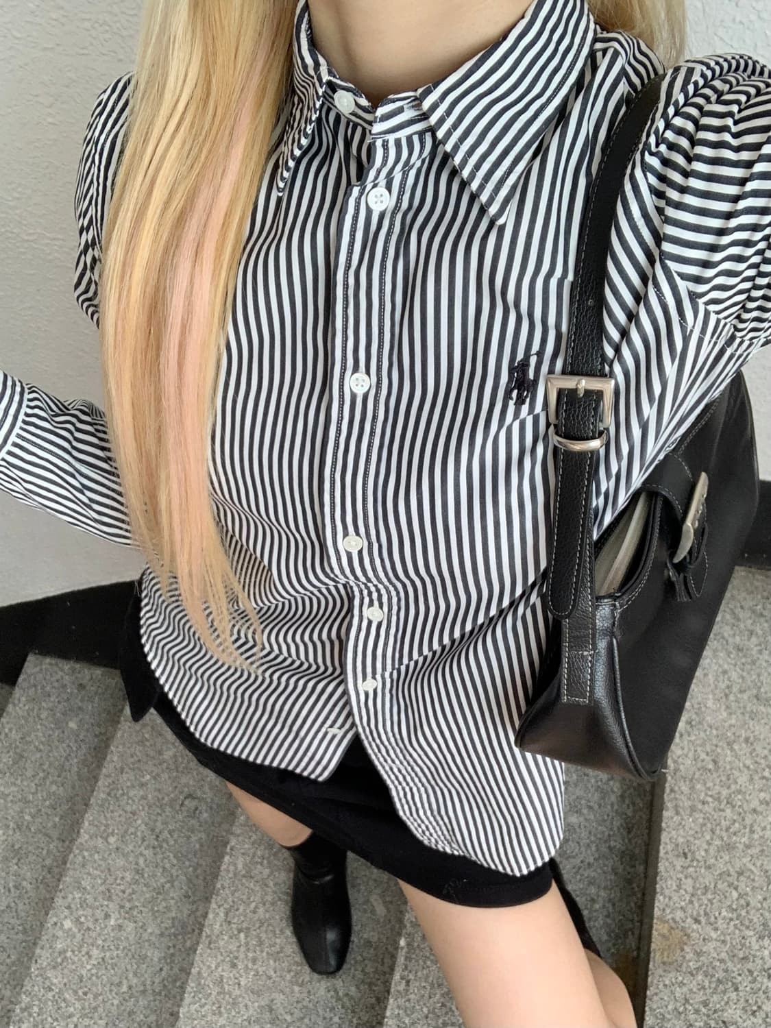 [품명/색상] : [M]폴로 여성 블랙 스트라이프 슬림스트레치 셔츠 [품 번] : 루키CK9053 [컨디션] : A (크리닝 및 고온스팀 완료) [택사이즈] : 여성용, 택표기 2 [실측사이즈] : 총장67 어깨38 가슴단면47.5 팔60 • 실제 가지고 계신 옷과 비교 측정하시면 도움이 됩니다. *모델 사이즈 163cm, 45kg [소재,두께감] : 얇고 바스락거리는 질감의 코튼100% [특이사항] : 컨디션 좋음 [권장사항]: 블랙, 네이비 등 짙은 컬러는 첫 세탁시 단독 세탁 권장