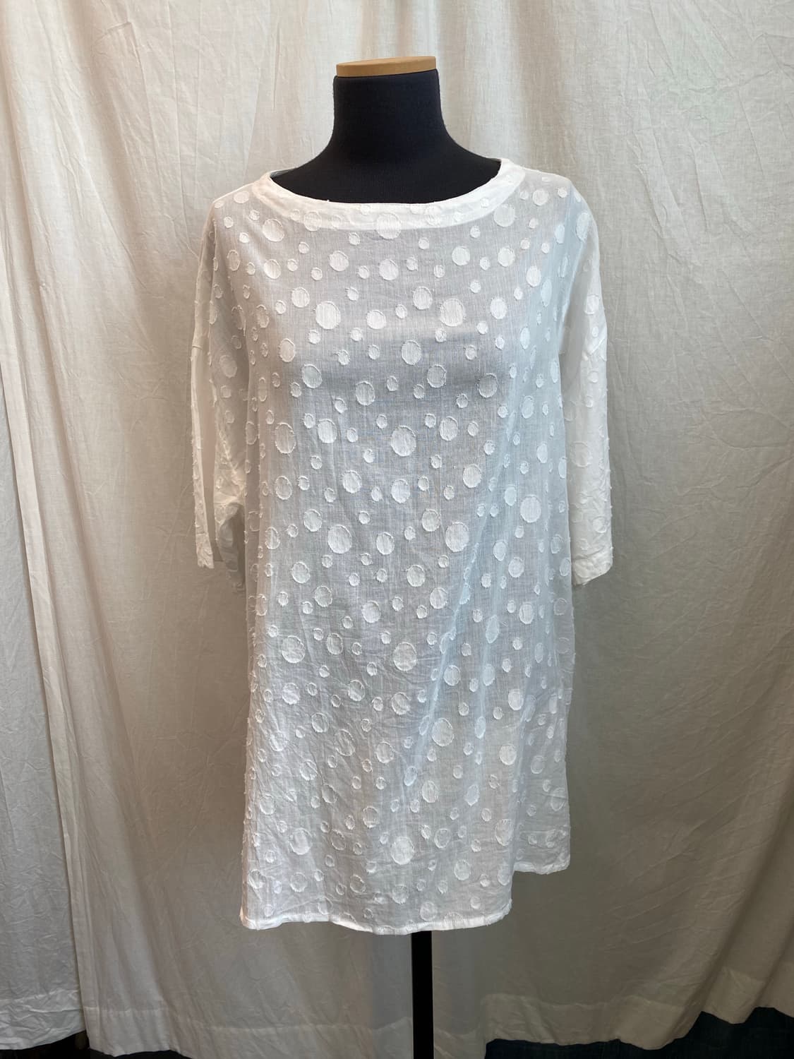 입체감있는 도트패턴이 유니크한 블라우스입니다. 면 100% 택사이즈 3L 실측사이즈 어깨 60 가슴 63 팔길이 23.5 암홀길이 23 밑단단면 67.5 총장/어깨라인기준 76