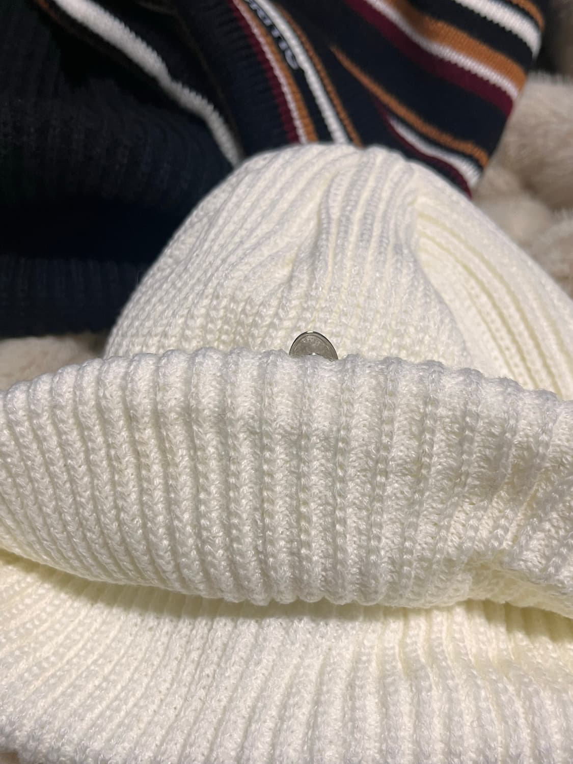 써저리 공홈에서 샀던 비니입니다 블랙 화이트 모두 2회 미만 착용이라 보풀 사용감 전혀 없어요, 다만 화이트는 1회 착용 했었는데 착용시 앞머리를 까고 써서 선크린이 묻어있습니다 세탁시 지워질 것 같은 오염인데 이 부분 고려해서 저렴하게 가격 책정했으니 감안하고 저렴하게 쓰실 분이 구매하셨음 좋겠습니다 사진에 있는 크리틱 비니는 덤이라 받으셔도 안 받으셔도 가격은 동일합니다 택배비는 반택시 1900원입니다