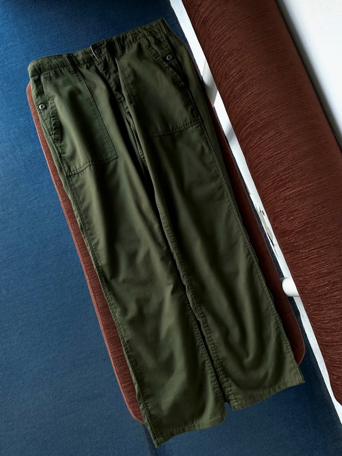 「Beams plus」 65/35 rayon blend straight fatigue pants • 폴리 레이온 혼방의 부드러우면서 매끈한 재질감 • 밀도감 있는 원단의 가볍고 쾌적한 표면감 • 드라이한 터치감이 있는 답답하지 않은 소재 • 전면 히든포켓 첨부 • 퍼티그 팬츠 모티브의 포켓 디테일 포인트 • 적당한 여유를 가진 정돈된 스트레이트 실루엣 Color | Olive Fabric | 폴리 65% 레이온 35% Size | M 허리 | 42 cm 밑위 | 33 cm 허벅지 | 34 cm 총장 | 102 cm 밑단 | 22 cm Model | 174 cm 63 kg