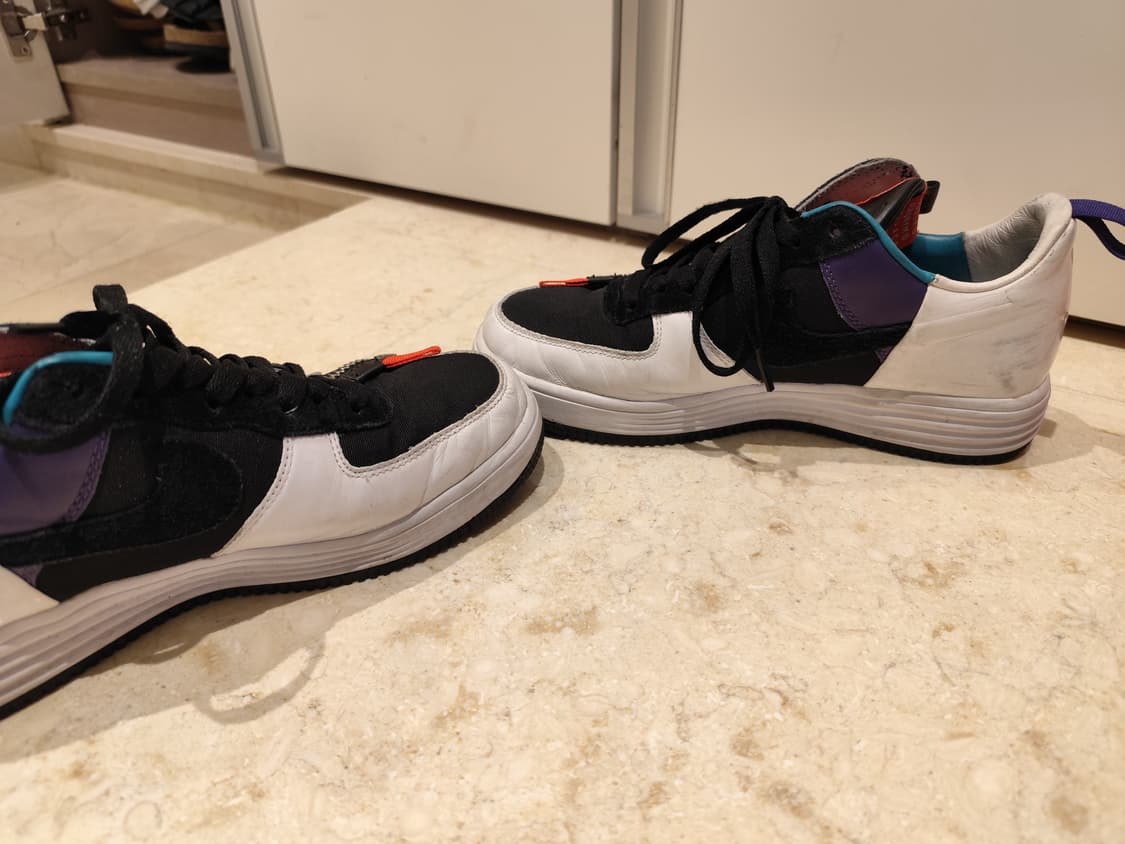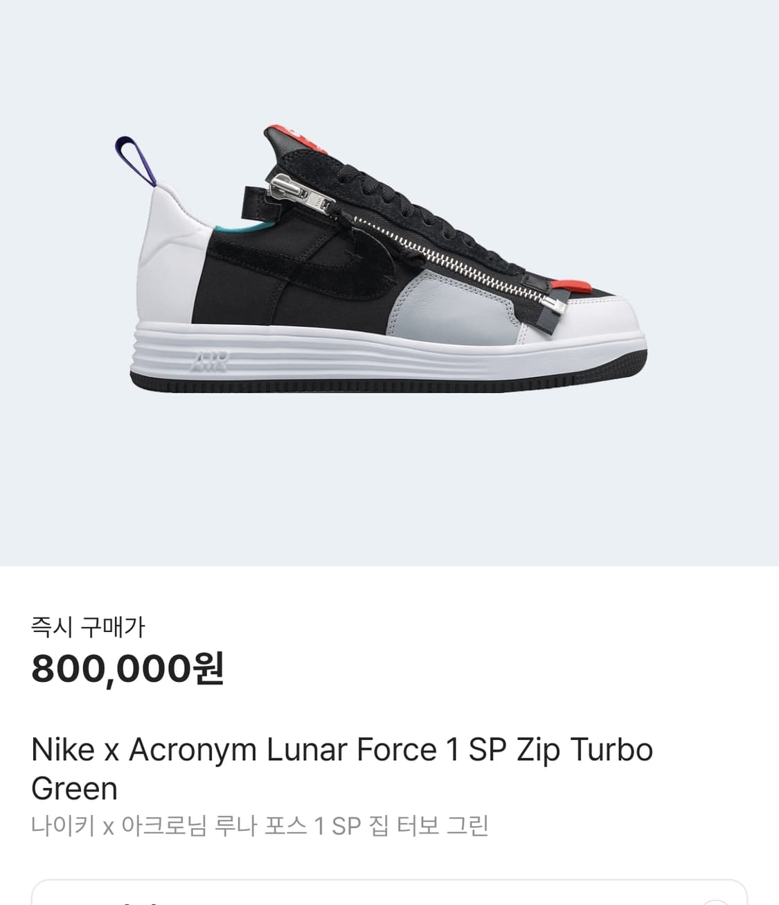 나이키 에어 루나 포스 아크로님 콜라보 250 판매 항상 핫한 브랜드 아크로님과 콜라보 제품으로 여러 소재의 조합과 사선으로 들어간 지퍼디테일등 디자인이 훌륭한 신발입니다 현재 크림가격 800,000원입니다 상태는 사진과 같습니다 싸게팔아요. 신발 단품입니다