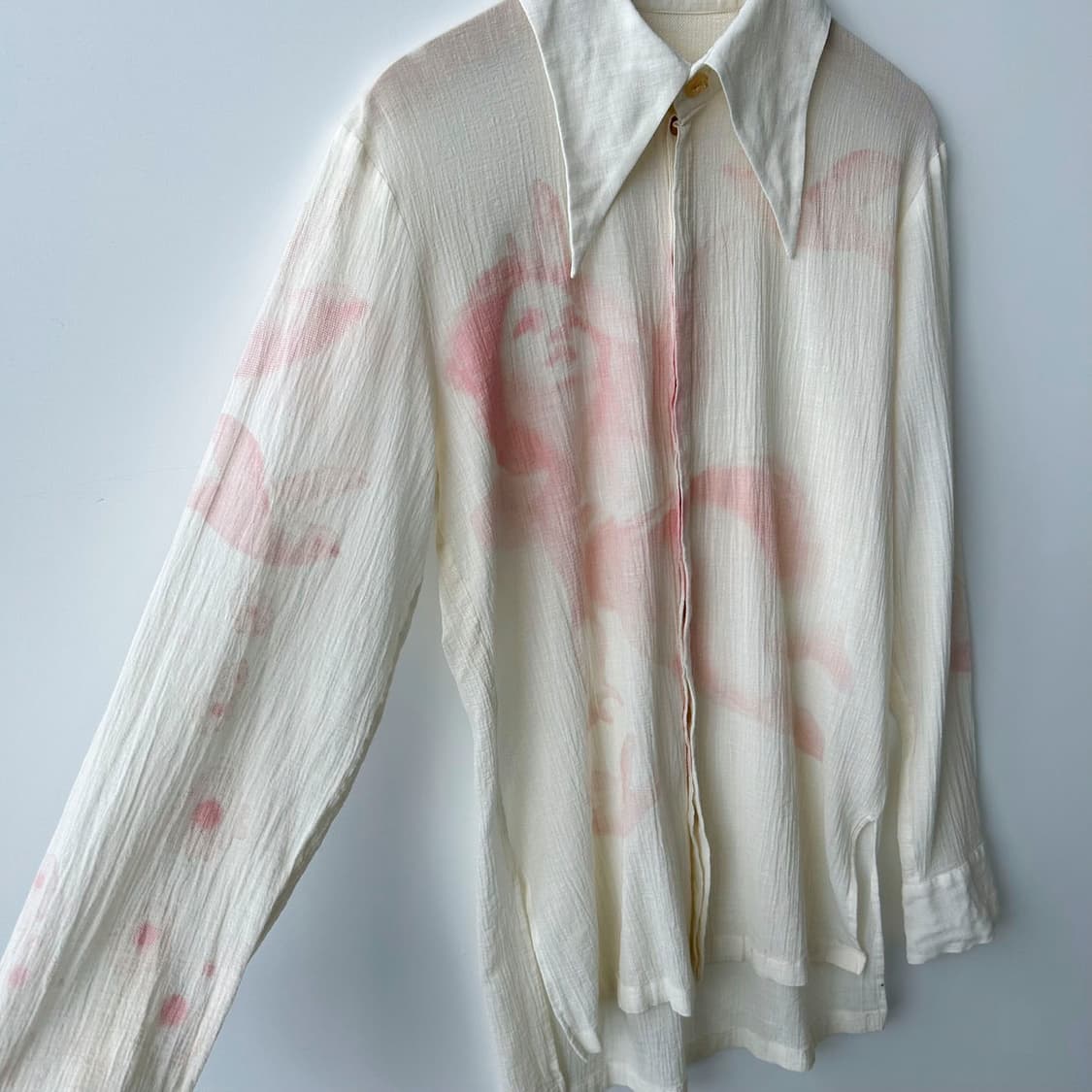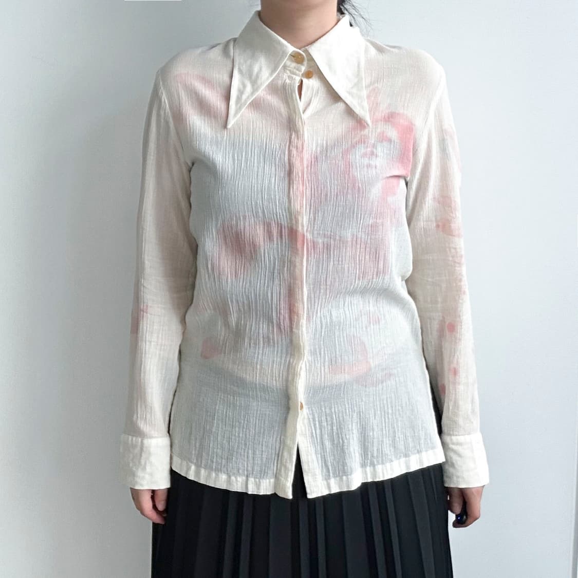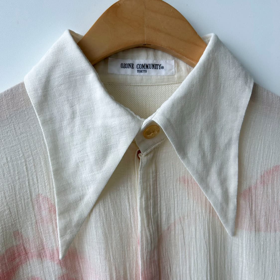 Ozone community angel print shirt 총장 앞 64 뒤 70 가슴단면 46 어깨 40 * 흔하지 않은 프린팅과 히든버튼 * 독특한 셔츠 카라 디테일 * 얇고 투명감있는 소재 두번째 단추는 잠그지 못했네요,,데헷🤤