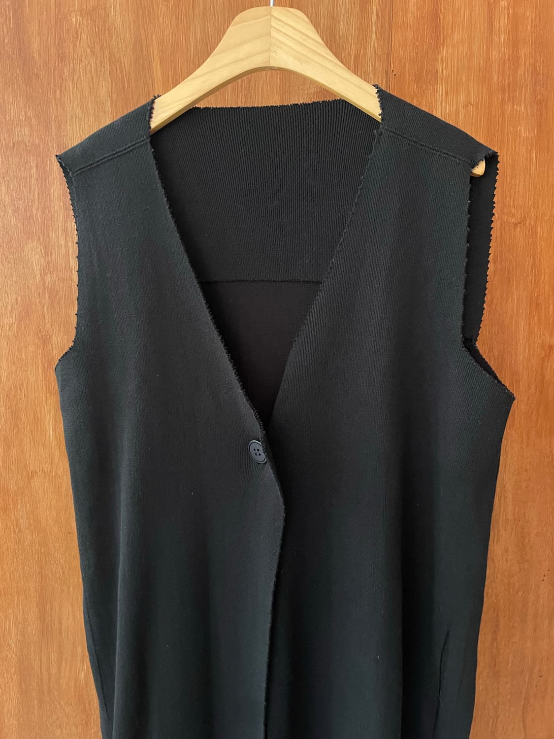 독특한 감각과 예술적인 패션을 선보이고 있는 세계적인 디자이너 이세이 미케와 SEIKO의 기술력이 만나 탄생하게 된 브랜드 ISSEY MIYAKE(이세이 미야케) 이세이 미야케 Haat 라인 제품, 컷팅된듯한 테두리 라인이 돋보이는 블랙 컬러바디 롱 베스트 전체적으로 양호한 컨디션 Shoulder : 43cm Chest : 53cm Length : 101cm