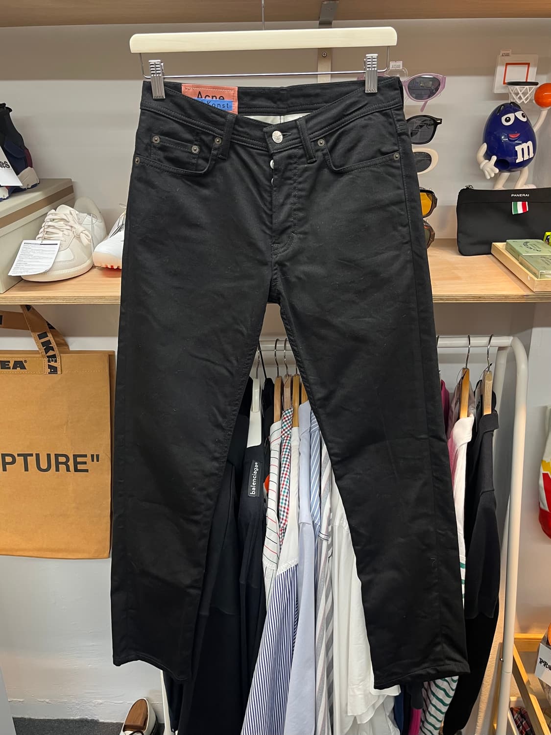 아크네 스튜디오의 bla konst 슬림핏 팬츠입니다 신축성 가미된 블랙컬러의 면소재 제품 특별한 데미지 오염없이 상태 좋습니다 사이즈 28X30 우체국 무료배송