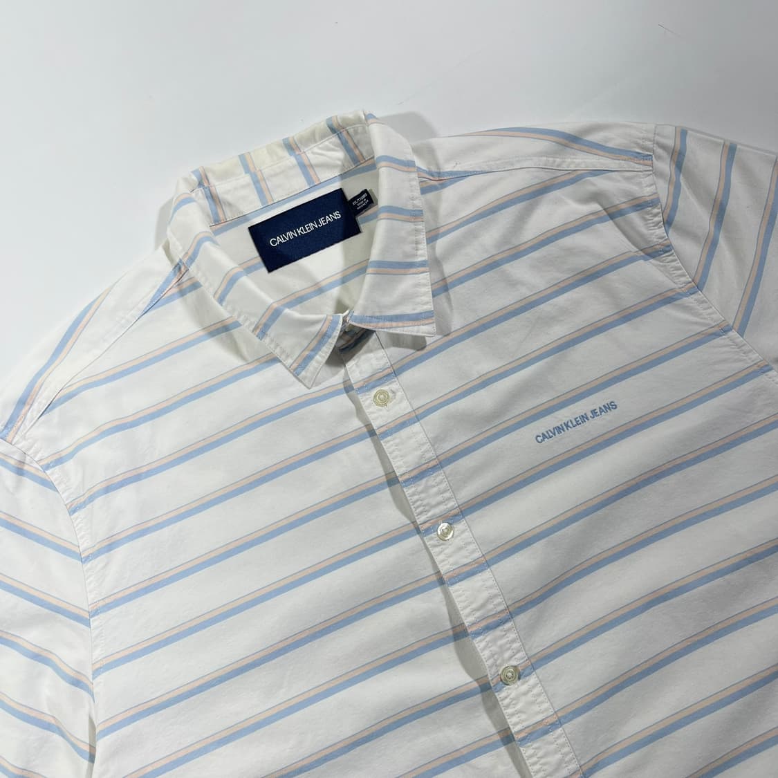 [Calvin Klein Jeans] 캘빈클라인진스 스트라이프 반팔셔츠 ₩ 30,000 ✔색상: 화이트 ✔주 소재: 면 ✔사이즈: 어깨/가슴/팔/총장 ✔2XL: 54/66/26/75