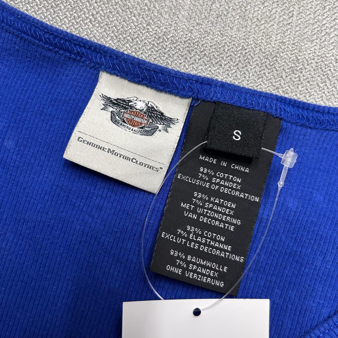 - 상태 9/10 사이즈(size) 표기 S 어깨 / 35cm 가슴 / 35cm 총장 / 63cm - - Harley Davidson - 블루 컬러 - 전, 후면 할리 데이비슨 로고 프린팅, 큐빅 디테일 - 신축성 좋은 원단 - y2k&스트릿 무드 - 큐빅 부분 손상 외에 좋은 컨디션(69800-> 59800으로 할인)