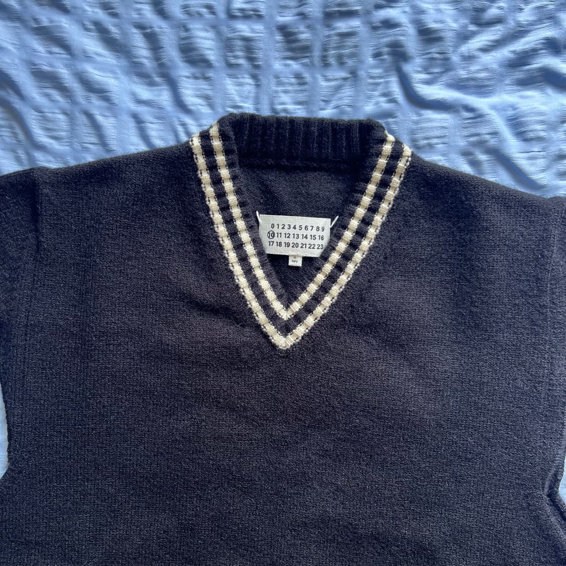 메종 마르지엘라 니트 베스트 (Maison Margiela Knitted Vest) 사이즈: M (46) 상태: 매우 양호 (착용감 거의 없음) 유니섹스 디자인으로 남녀 모두 착용 가능해요. 구성품: 제품 단독 빠른 배송 가능 설명: 메종 마르지엘라의 2021년 가을/겨울 시즌 제품이에요. 30% 양모 혼방 니트 원단으로 제작되어 고급스럽고 포근한 촉감을 자랑해요. 클래식한 브이넥 라인과 스트라이프 마감 디테일, 등판의 4 스티치 마르지엘라 시그니처 장식도 그대로 살아있습니다. 셔츠나 티셔츠와 레이어드하면 더 멋스럽게 연출할 수 있어요. 사이즈 (M/46 기준): 가슴 120cm / 총장 72cm / 어깨 46cm