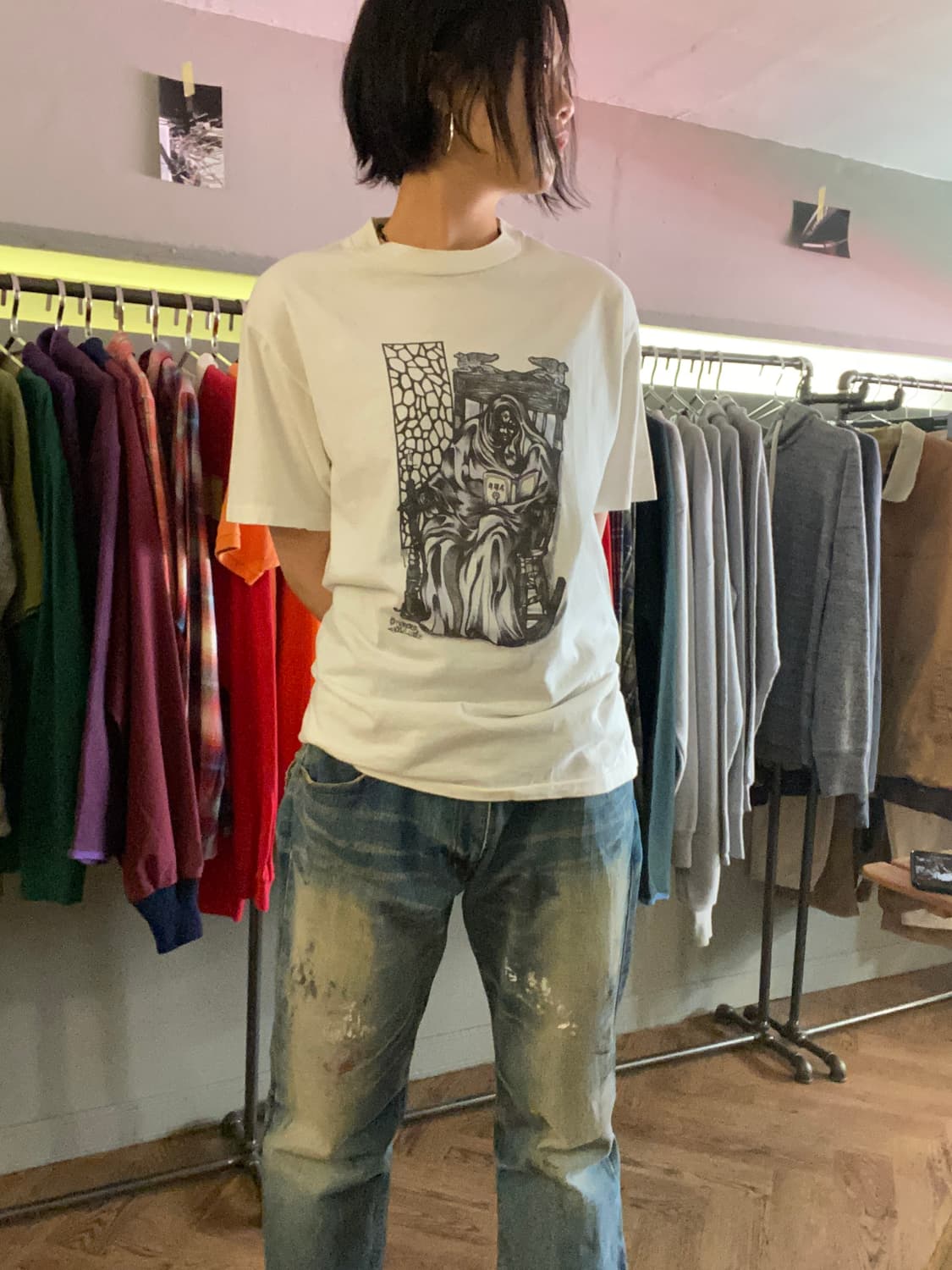 90‘s Oneita cross printing T-shirt 미국 오네이타사의 십자가 프린팅 티셔츠입니다. 아메리칸 빈티지의 명가 오네이타에서 나온 프린팅 티셔츠로 싱글 스티치와 옆선 봉제선이 없는 튜블러 형태가 특징인 티셔츠입니다. 앞뒤에 락시크, 고딕 무드의 프린팅이 들어가 있어 이런 무드를 좋아하시는 분들이라면 마음에 들어할 티셔츠입니다! 날씨가 많이 풀린 요즘 데님이나 카고팬츠에 툭 걸치기 좋은 녀석으로 사이즈가 맞으시는 분들에게 추천하는 제품입니다! - 총장 68 어깨 48 가슴 50 소매 21 - Size: M - Price: 2.7 - • 빈티지 특성상 약간의 오염이 있을 수 있습니다. • 교환, 환불이 어려워 신중한 구매부탁드립니다. • 약간의 사이즈 오차(1,2cm)가 있을 수 있습니다. - Contact DM Discount ALSO