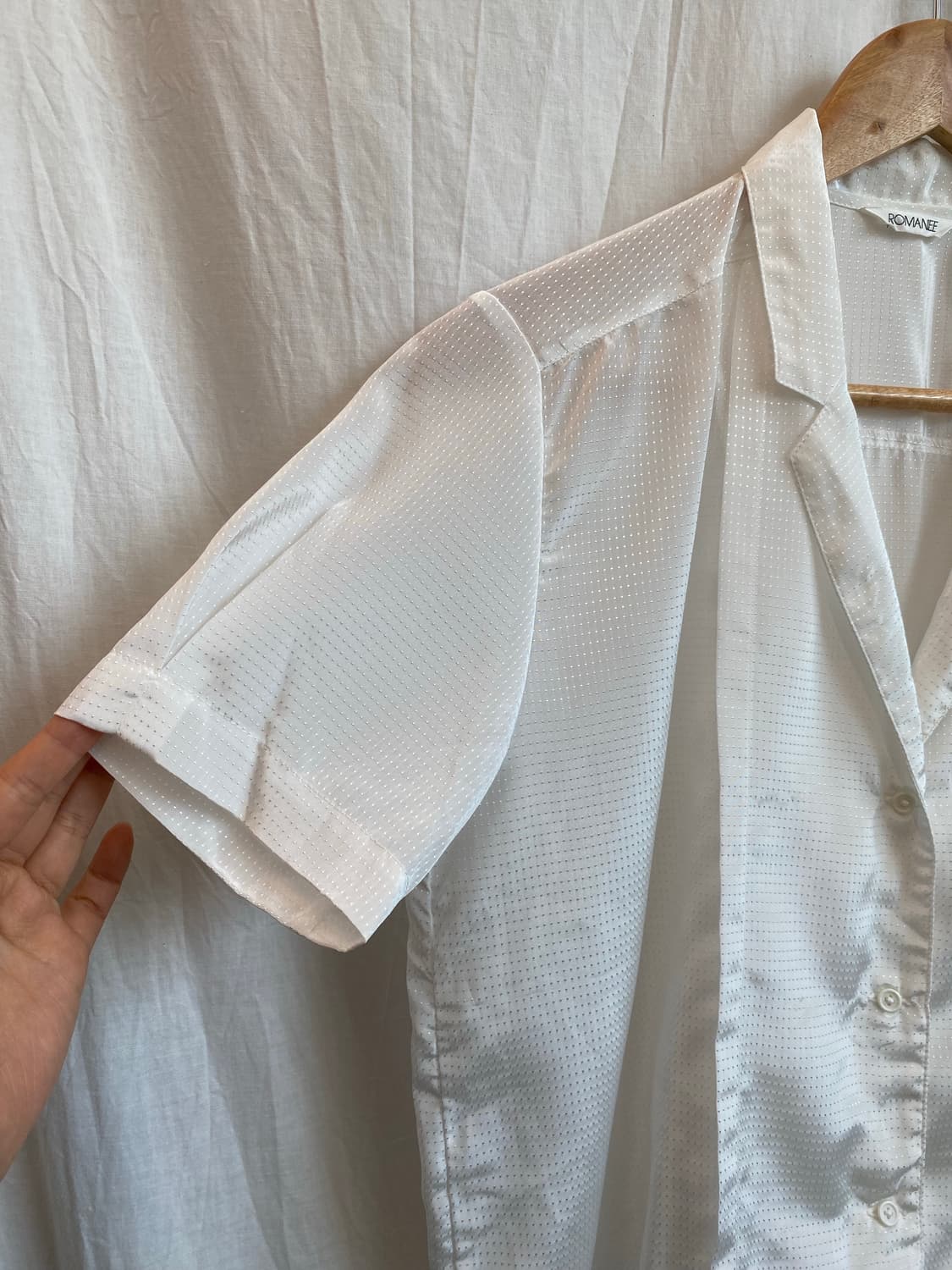 정말 작은 도트패턴처럼 보이는 패턴이 있는 소재입니다. 앞면에 단추가 있었던 흔적이 있습니다. 사진 참고바랍니다. 폴리 100% 실측사이즈 77까지 추천 어깨 38.5 가슴 50.5 팔길이 23 암홀길이 24 밑단단면 50 총장/어깨라인기준 63