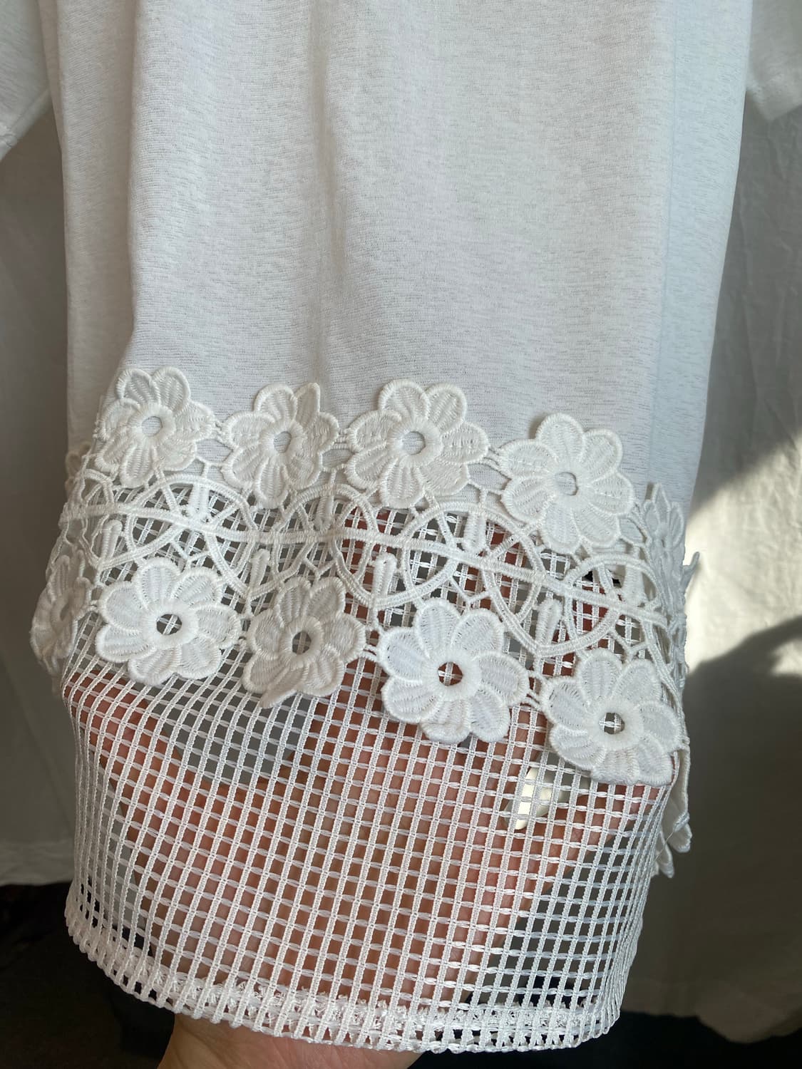 페미닌한 무드의 밑단 디테일의 반팔 블라우스입니다. 살짝 비침이 있고 탄성이 있는 소재입니다. 폴리 95% 폴리우레탄 5% 택사이즈 M-L 실측사이즈 어깨 38 가슴 47.5 팔길이 25 암홀길이 22.5 밑단단면 62.5 총장/어깨라인기준 65