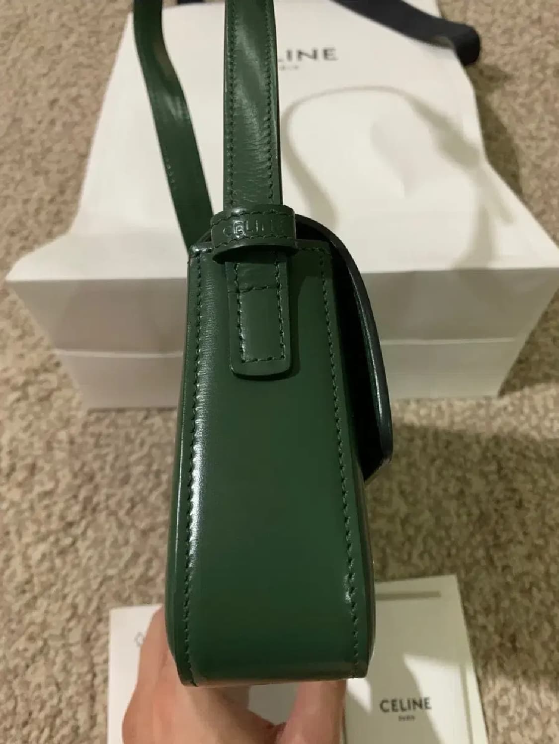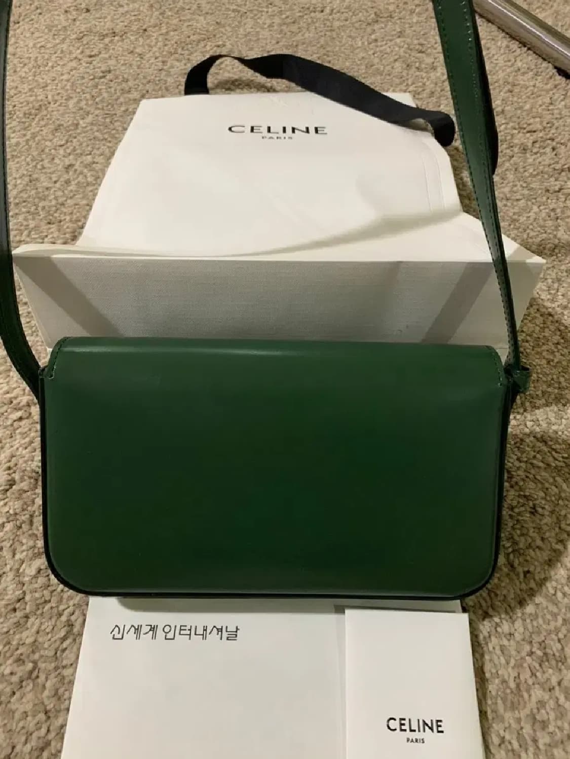 광교 갤러리아 셀린느 구매제품 입니다. 고급진 딥그린 색으로 블랙과는 전혀다른 고급스러운 느낌 입니다. 구매후 거의착용하지않아 새상품급 컨디션 유지중입니다. 금장 생활잔기스 존재. 구성품 구매당시 모두 보유하고 있습니다. 직거래시 수수료 네고가능합니다.