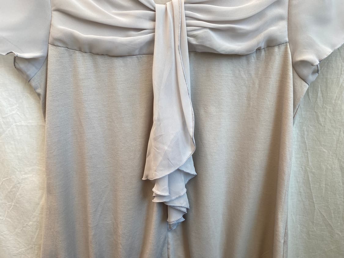 페미닌한 라인의 반팔블라우스입니다. 옅은 그레이퍼플컬러가 매력적입니다. 폴리 60% 레이온 35% 폴리우레탄 5% 택사이즈 M 실측사이즈 어깨 33.5 가슴 43 팔길이 16.5 암홀길이 23 밑단단면 41.5 총장/어깨라인기준 64.5