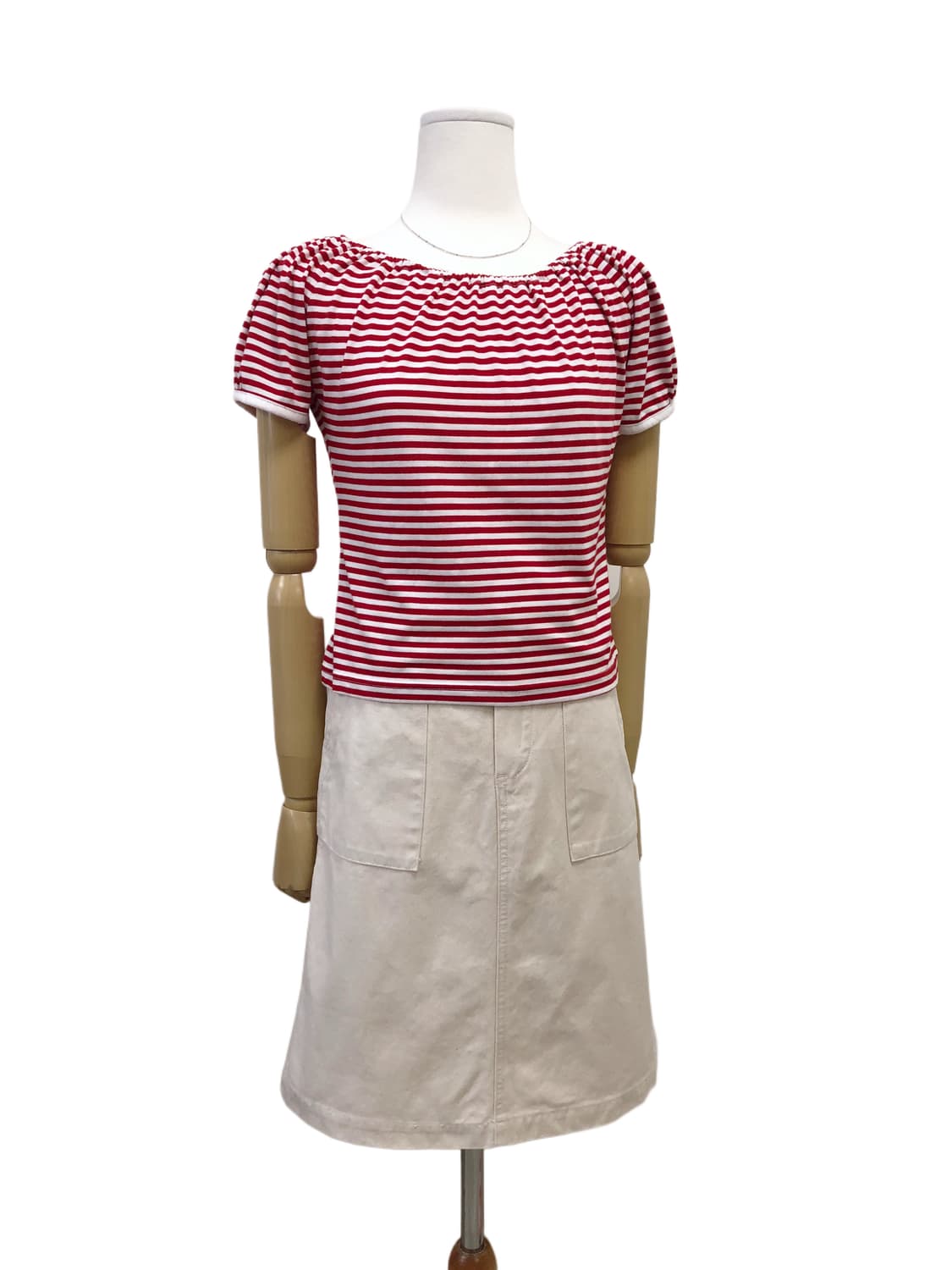 ⠀ 레드 스트라이프 티셔츠 사이즈(cm): 가슴 단면 48 | 기장 49 소재: 폴리에스테르 65%, 레이온 35% 특이사항: 1. 숏한 기장감에 청량한 레드 스트라이프 색상이 멋스러운 티셔츠입니다. 2. 소매 끝단에는 흰색으로 마감 처리가 되어 있어 동글동글 더욱 앙증맞습니다. 3. 넥 라인에 밴딩 처리가 되어 있어 오프숄더로 연출 가능합니다.