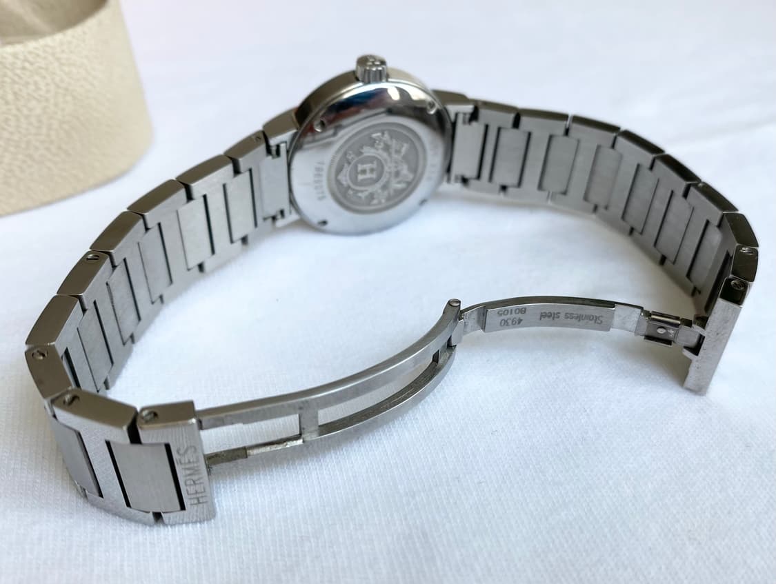 에르메스 노마드 여성용 28mm NO1.210 스틸 블랙 할인 어려우며, 사진 및 내용 그대로 판매중인 제품이오니 반드시 참고 부탁드립니다. 에르메스 노마드 여성용 중형 28mm쿼츠 모델이며, 블랙 다이얼의 깔끔한 디자인이 실물의 느낌이 보기 좋은 편한 착용감이 좋은 제품입니다. 큰찍힘이나 손상없이 약한 생활기스 정도의 컨디션 좋은 제품이며, 배터리 교환 완료하여 깨끗하게 보관중입니다. 제품 사이즈 28mm 부속품) 정품 케이스 책자류 여분줄 개런티북(스탬핑 X) 여분줄 포함 17cm 여성분 넉넉한 사이즈 국내 매장에서 정상적인 as 가능. 궁금하신 부분 문의 주시면 답변드리겠습니다