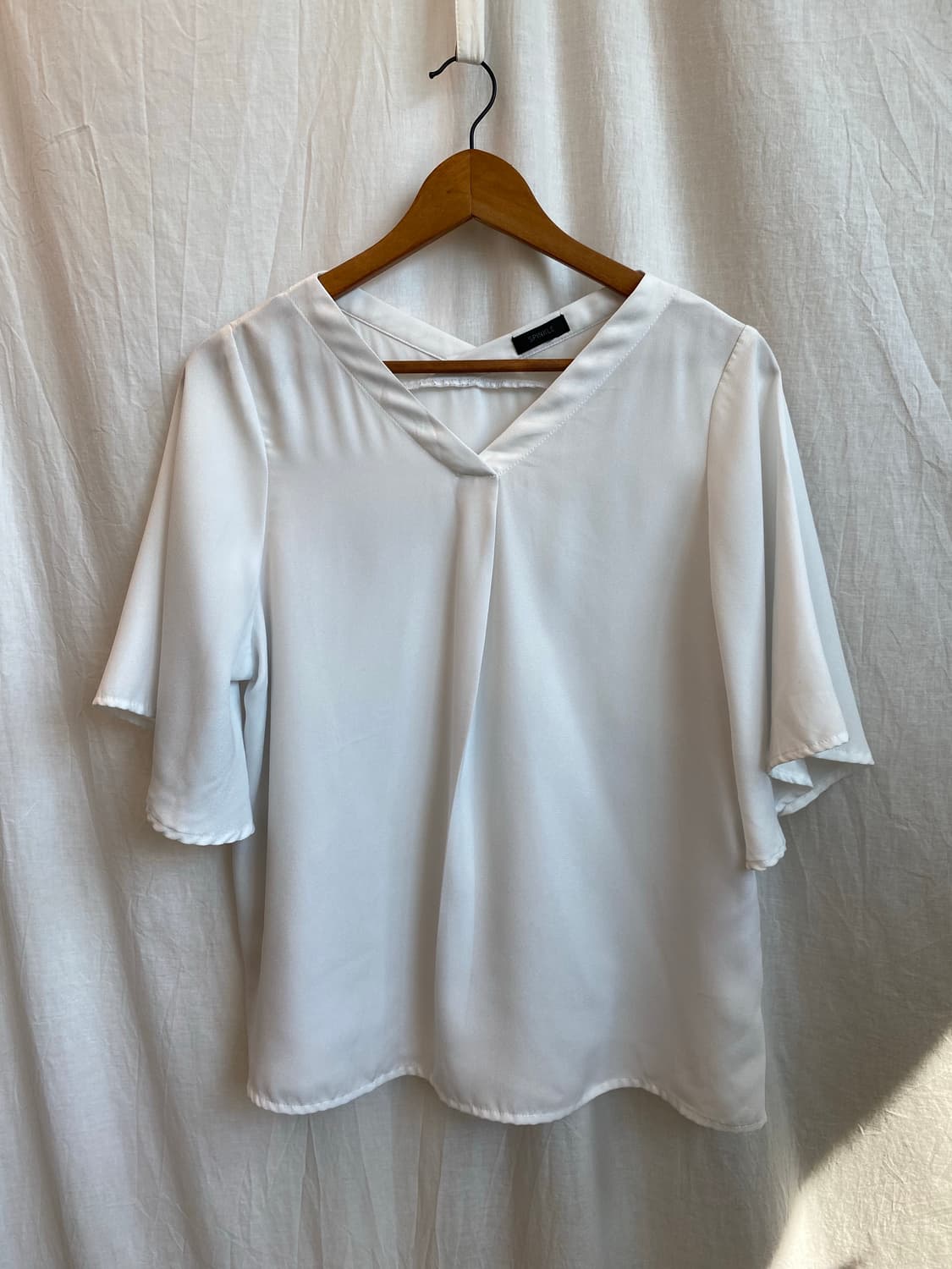 페미닌한 소매라인이 매력적인 반팔 블라우스입니다. 폴리 100% 택사이즈 M 실측사이즈 넉넉한 사이즈로 77까지 추천 가슴 53 팔길이 31 암홀길이 28 밑단단면 53 총장/어깨라인기준 60