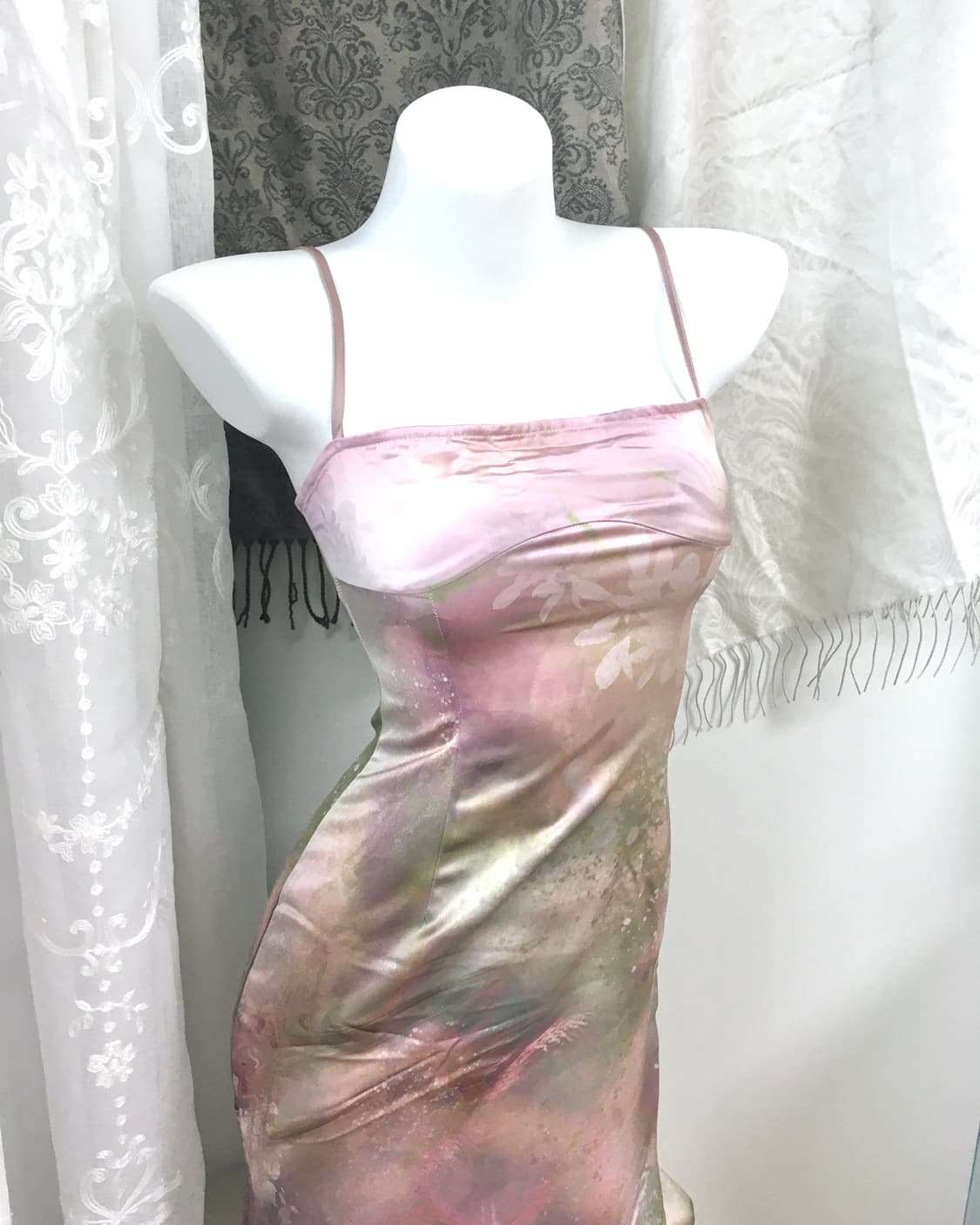 핑크 오리엔탈 새틴 슬림 슬리브리스 원피스