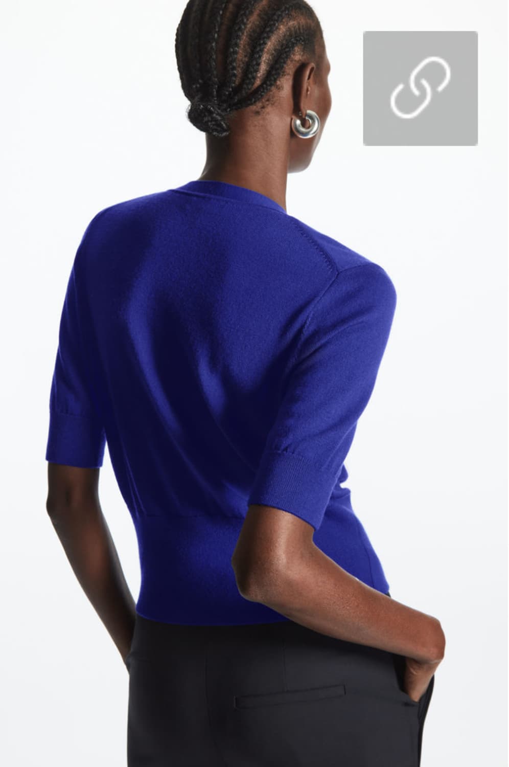 COS 코스 크롭 쇼트 슬리브 울 가디건 반팔 가디건 블루 M사이즈입니다(정가:105,000) 한번 단시간 착용하였고 상태 매우 좋아요! 반값택배 1500 일반택배 3500