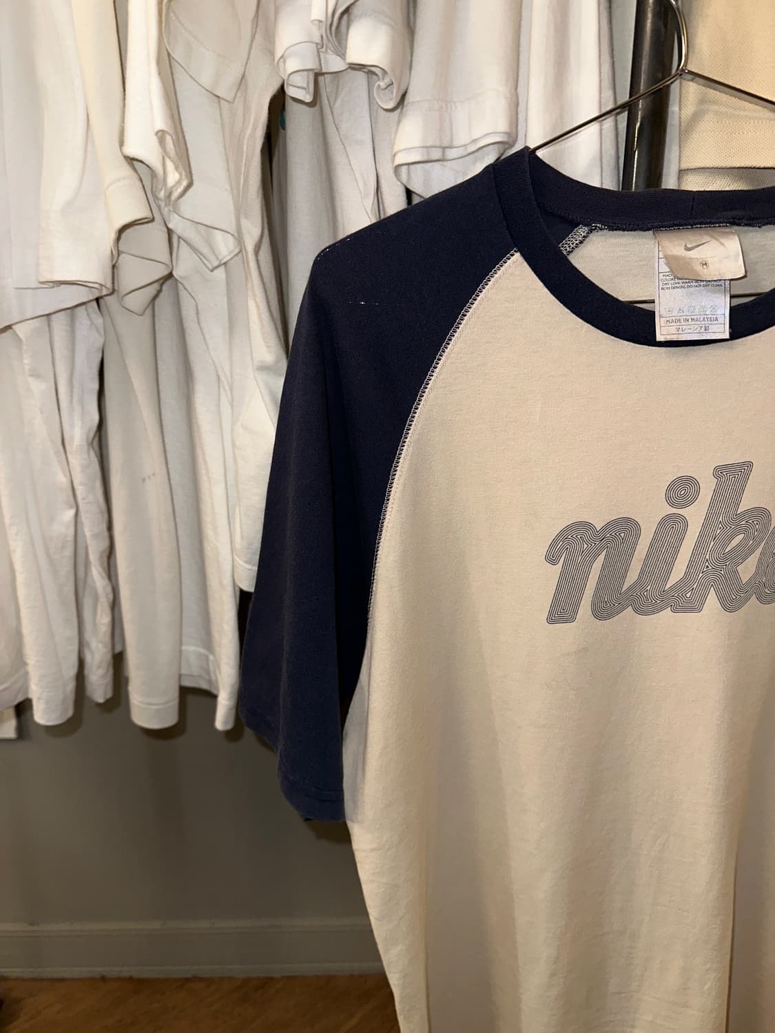 00‘s Nike logo raglan detail T-shirt 스포츠계의 가장 대표적인 브랜드이자 역사도 깊은 브랜드인 `Nike’ 사의 로고 라글란자의 티셔츠입니다. 현재는 스포츠 브랜드의 이미지가 스티브 기반의 인지도기 있긴 한 브랜드이지만 과거에는 펑크와 스트릿 기반의 힙합의 유행, 거기다 조던의 패션화가 이뤄지면서 자연스럽게 패션 브랜드 중의 하나로 인식이 점차 되는 브랜드입니다. 배색자체가 상당히 귀엽기도 하면서 가슴에 들어간 나이키 로고 또한 매력적인 티셔츠입니다. 90년대 나이키들도 좋지만 이러한 2000년대 나이키들도 어느정도 매력도가 있는 거 같네요. 오버핏으로 착용되는 녀석으로 사이즈가 허용되는 분들께 권해드리는 제품입니다! - 총장 68 어깨 50 가슴 57 소매 24 - Size: M (표기) - Price: 3.0 - • 빈티지 특성상 약간의 오염이 있을 수 있습니다. • 교환, 환불이 어려워 신중한 구매부탁드립니다. • 약간의 사이즈 오차(1,2cm)가 있을 수 있습니다. - Contact DM Discount ALSO