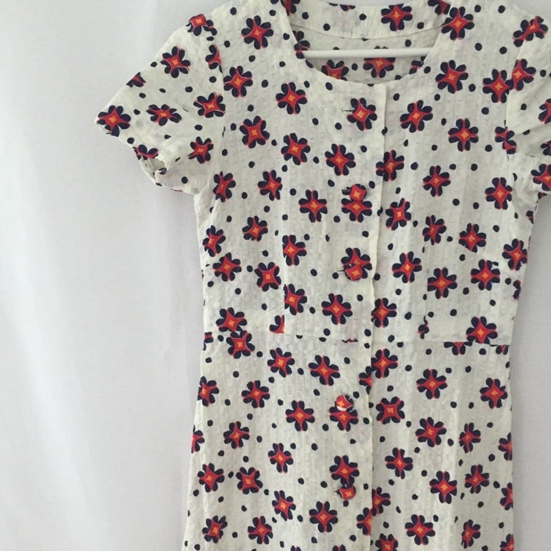 어깨 34 / 가슴 38 / 소매 23 / 총장 98 케어라벨 x -쨍한 레드 플라워 패턴 -적당한 슬림핏 -단추 디테일로 착용 -벌어짐 방치 버클 -시어서커 소재 -일본 빈티지 무드 -컨디션 8/10 모델 사이즈 •163 / 55 size ( 하체 발달형 ) @goul.vint