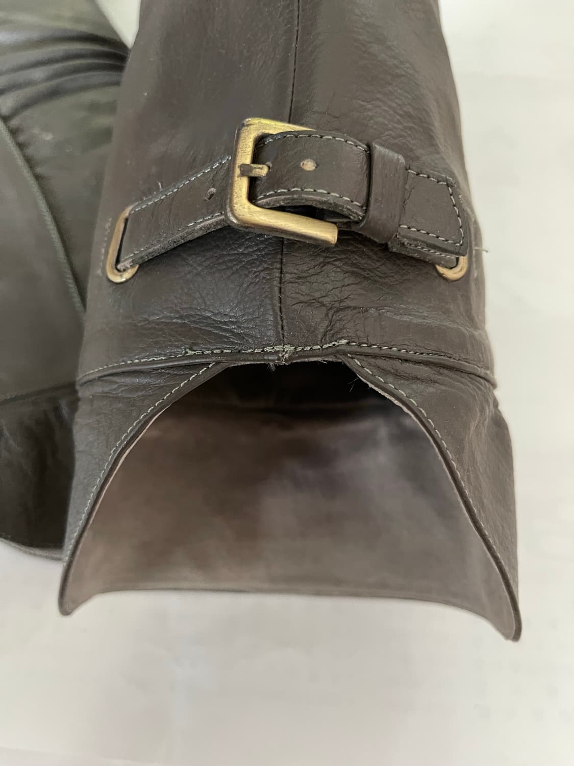 아이삭 소가죽 롱부츠입니다 가죽의 자연스러운 주름과 불규칙한 표면 질감 탄탄하면서도 사용감의 자연스러운 주름 편하게 신기 좋은 디자인이에요 브랜드: isaac 사이즈: 235 굽높이3 * 굽 제외 길이42