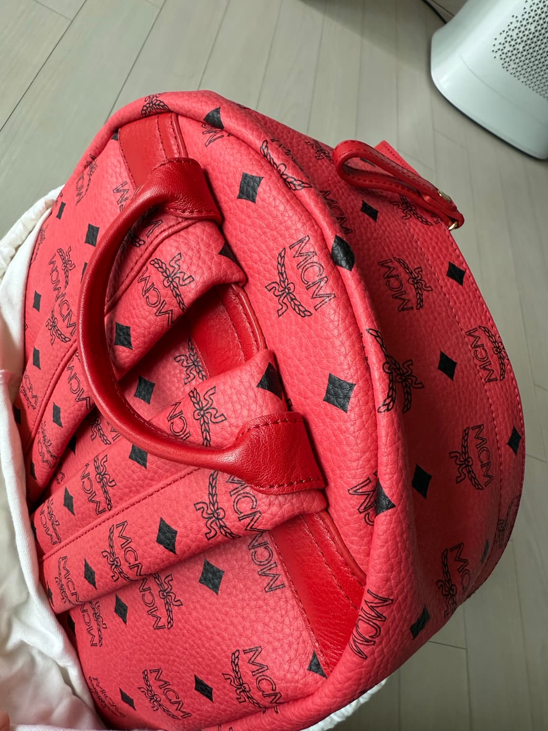 • MCM 미니 백팩 모노그램 패턴 스터드 지퍼 포켓 디테일 레드