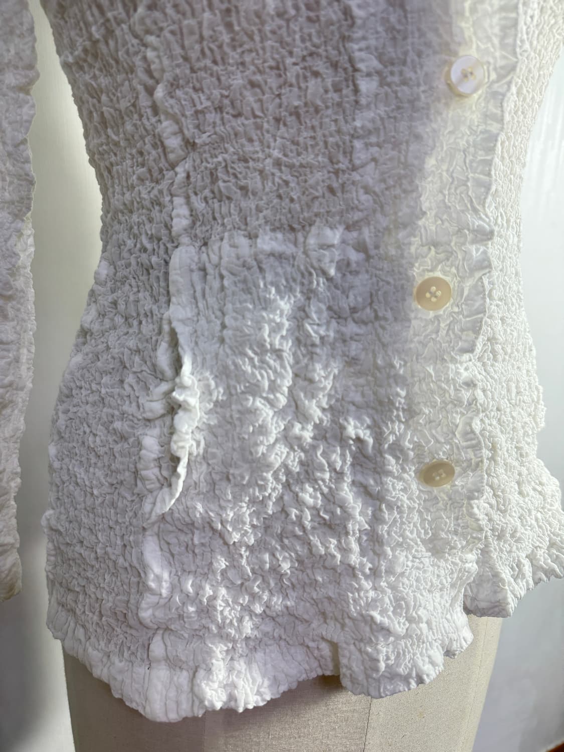 Brand: Issey Miyake Me 1270 Size: F (어깨 37~38 가슴 42~43 기장 57~58 팔길이 52~53) 신축성있는 원단이라, 실측이 크게 의미는 없습니다. Condition: 9/10 Product: 이세이 미야케의 여성복 라인 me ISSEY MIYAKE의 크링클 셔츠 재킷입니다. 화이트 컬러에 텍스처가 살아 있는 크링클(주름) 소재로 제작되었으며, 자연스럽게 바디를 감싸는 구조적 실루엣이 특징입니다. 가벼운 착용감과 높은 신축성 덕분에 일상적으로도 활용 가능하며, 포멀한 셔츠 스타일과 캐주얼함이 조화를 이루는 아이템입니다. 빈티지 제품 특성상 교환 및 환불은 어렵습니다. 빈티지한 컨디션으로 상태에 예민하신 분은 구매를 피해주시면 감사하겠습니다.
