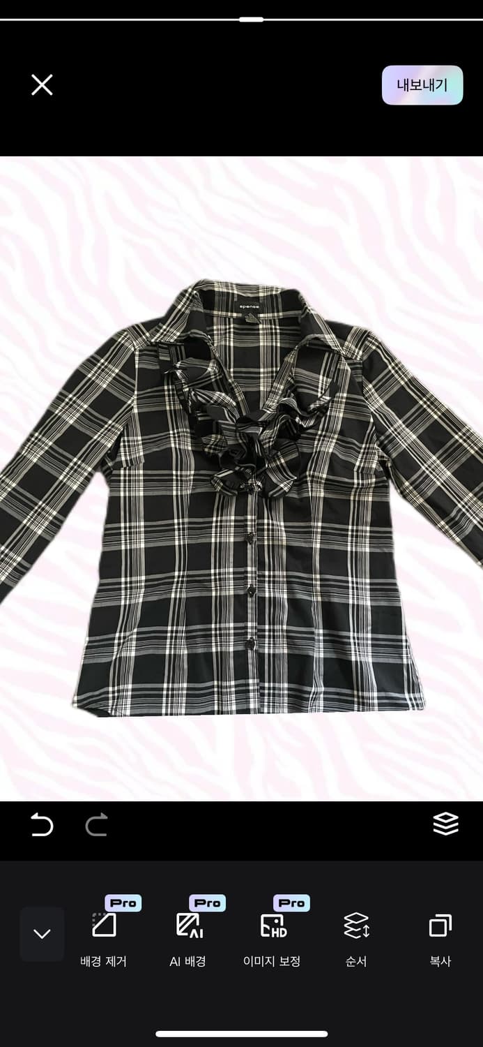갸루깔의 프릴 체크 셔츠입니다 ! 상의 55 기준 적당히 붙는 핏입니다 프릴이 너무 예쁘구요 ..💕 브이넥으로 목이 트여있어서 안답답해보여요 !!