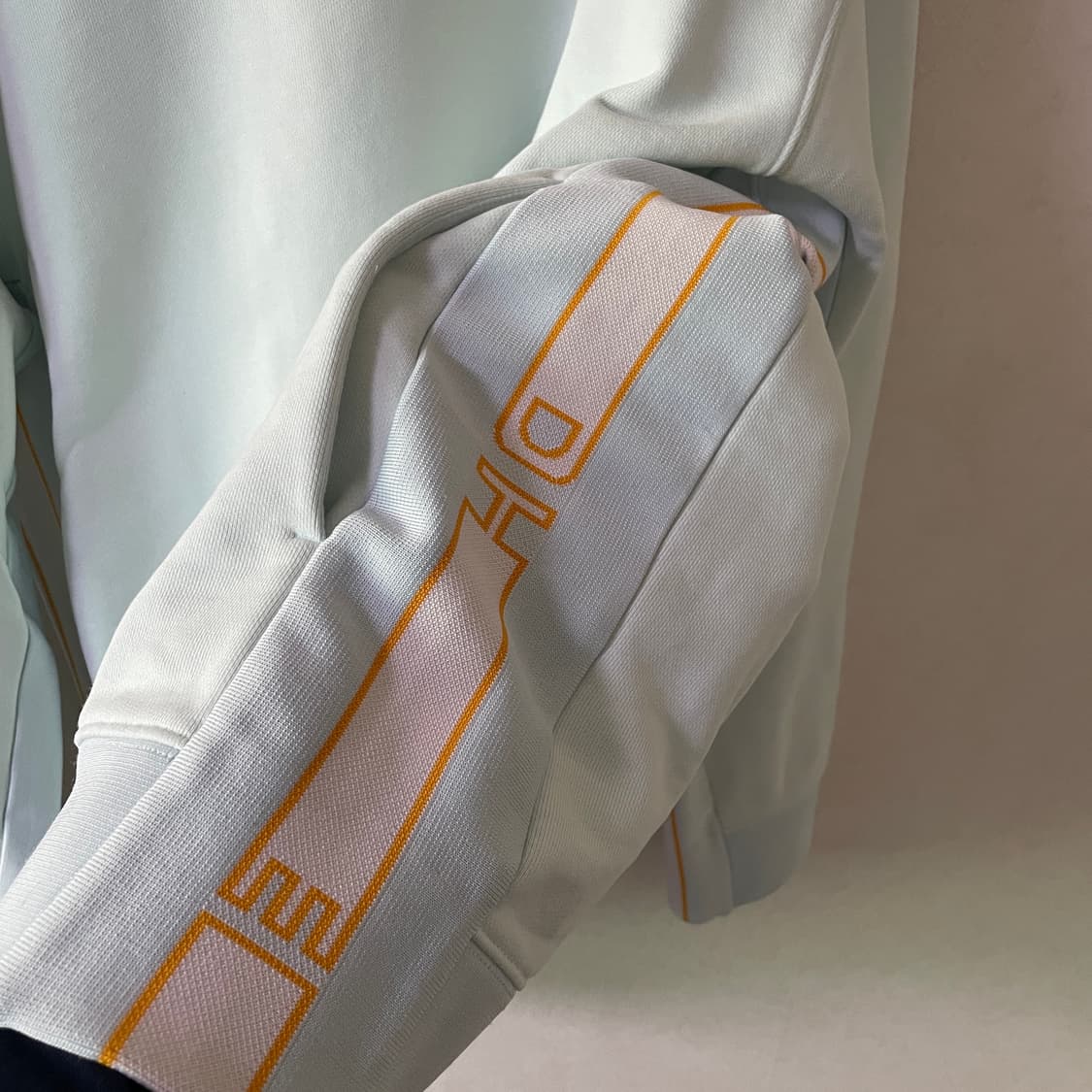 솔리드옴므 우영미 허리라인 로고 스웨트 긴팔티셔츠입니다. 사이즈는 48이나 오버핏으로 나와서 평소 105까지 좋습니다. (가슴 61 기장 76 팔 65 어깨 54 정도) 민트컬러로 깨끗하고 드라이 완료한 상태이나 우측 팔 뒷쪽에 미세 오염 존재합니다. 이외에는 깔끔하구요 거의 티나지않아서 편하게 입으실 분 추천드립니다.