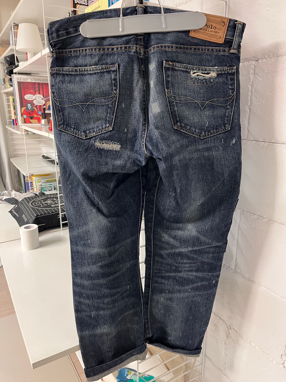 폴로 랄프로렌 패치워크 데님 32사이즈 (폴로 매장구매상품 구제아닙니다.) 32x32 사이즈 구입해서 기장 수선만 했습니다. (96cm) 총기장 어차피 셀비지 데님이 아니어서 밑단 수선만 깔끔하게 해주었고 실착용이 적어서 보시면 아시겠지만 밑단의 마모나 오염 데미지가 없습니다. 비즈빔이나 캐피탈 스러운 패치워크 디자인으로 착용했을때 더 보기 좋은 데님 팬츠 입니다. 판완