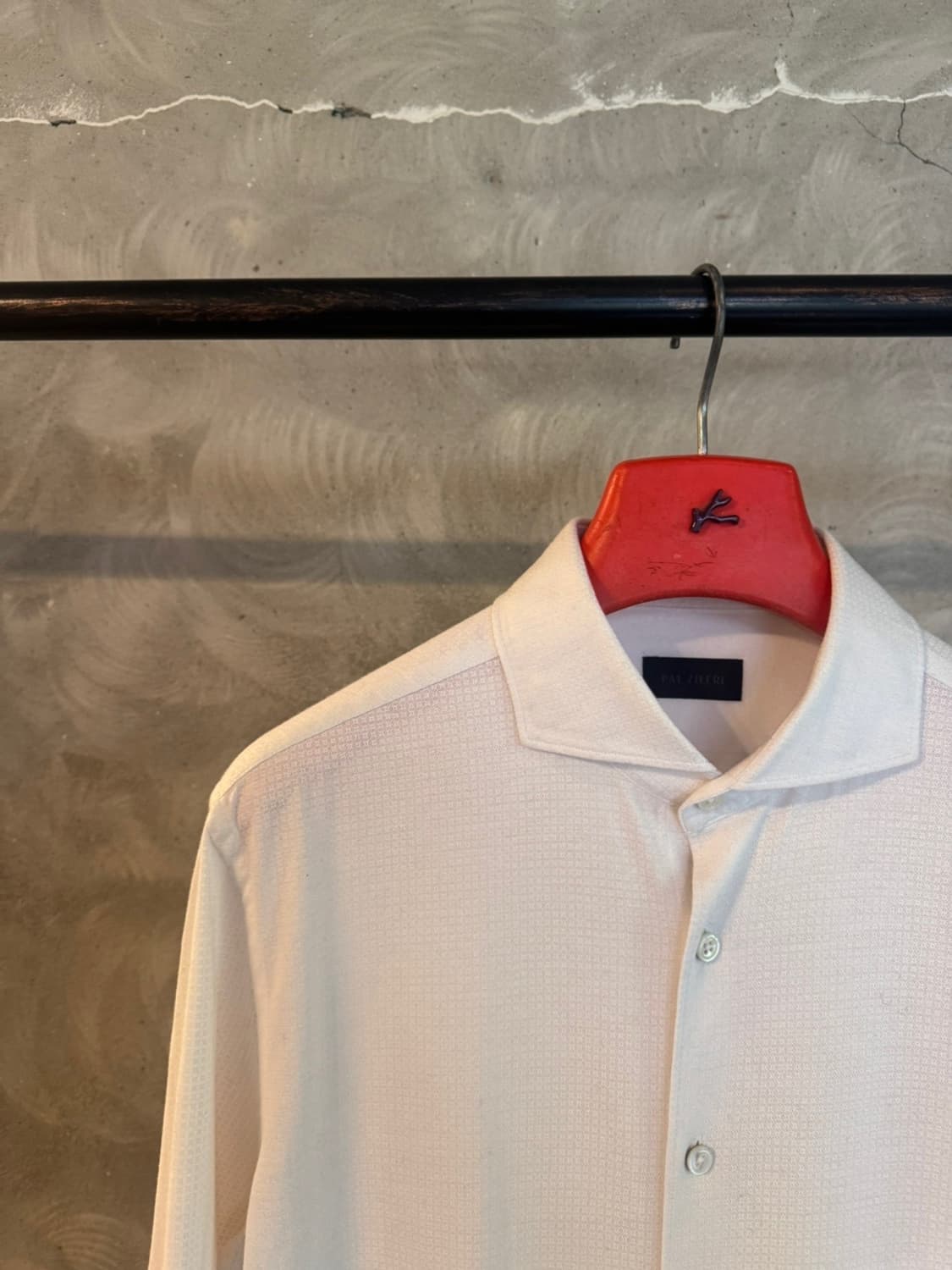 가만히 두고 보아야 보이는 조용한 패턴이 전하는 직관적인 고급감은 하이엔드 브랜드들이 사이사이에 접근하는 방법이기도 하죠. 그 맥락을 같이 한 빨질레리의 드레스셔츠입니다. 사이즈 100