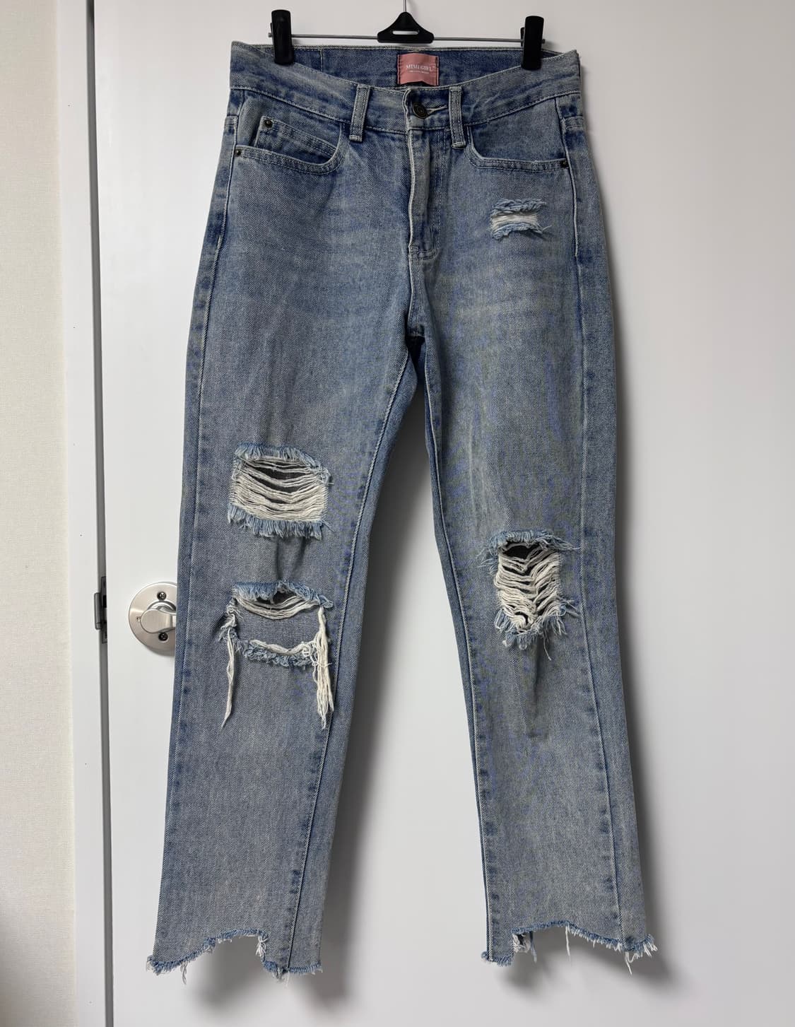 사용감은 있는편이고 오염 하자 없어요 (사용감 사진으로 확인해주세요) 색상 윗부분 진청 아랫부분 연청 그라데이션 사이즈 S (cm) 허리35 허벅지26 종아리18 총장90 라인 잘잡아주고 스판없어요 밑단 데미지컷으로 얇아보이고 길어보여요 세미 스키니 스트레이트 체형 알맞는 핏