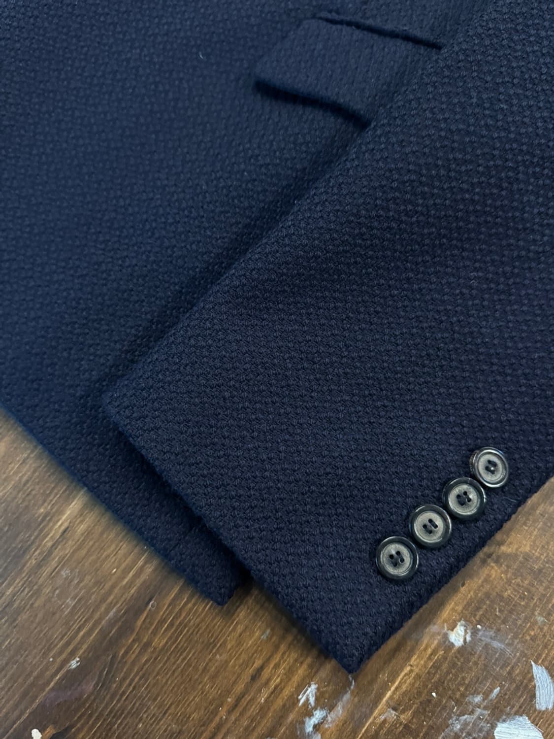 명료한 네이비색감의 고급감과 와플질감의 텍스처에 기댄 모던한 실루엣으로 기준을 잡은 솔리드옴므의 한장입니다. 사이즈 국내 슬림 100ㅡ100 추천합니다. 감사합니다.