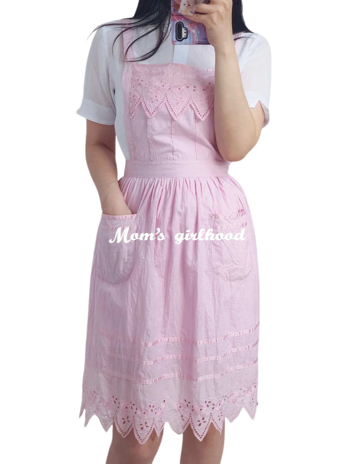 은은한 핑크톤의 코튼 원단에 정교한 펀칭 자수와 스캘럽 컷 디테일이 더해진 빈티지 에이프런입니다. 가슴과 밑단의 컷워크 레이스와 새틴 테이핑이 조화롭게 어우러져 클래식하고 로맨틱한 무드를 연출해줍니다. 실제 사용 가능한 포켓이 양쪽에 있어 스타일과 기능을 모두 갖춘 아이템으로, 홈카페나 촬영 소품으로도 잘 어울립니다. ※전체적으로 사용감과 미세한 이염 및 자연스러운 구김이 있습니다. 총장102