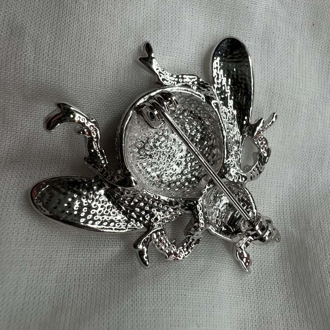 "[PRODUCT INFO] 소재: 합금, AB 큐빅, 유백 비즈 사이즈: 약 4cm × 3.5cm 컬러: 실버 베이스 + 오로라 큐빅 + 화이트 비즈 제조국: Unknown / Vintage import • 고광택 실버 베이스 위에 오로라 큐빅으로 다채로운 반짝임을 연출한 벌 형태의 빈티지 브로치. • 왕관 모티프와 유기적인 다리 형태로 클래식함과 독특함이 공존함. • 화려하지만 빈티지한 정서가 느껴지는, 시선을 확실히 잡아끄는 스타일 피스."
