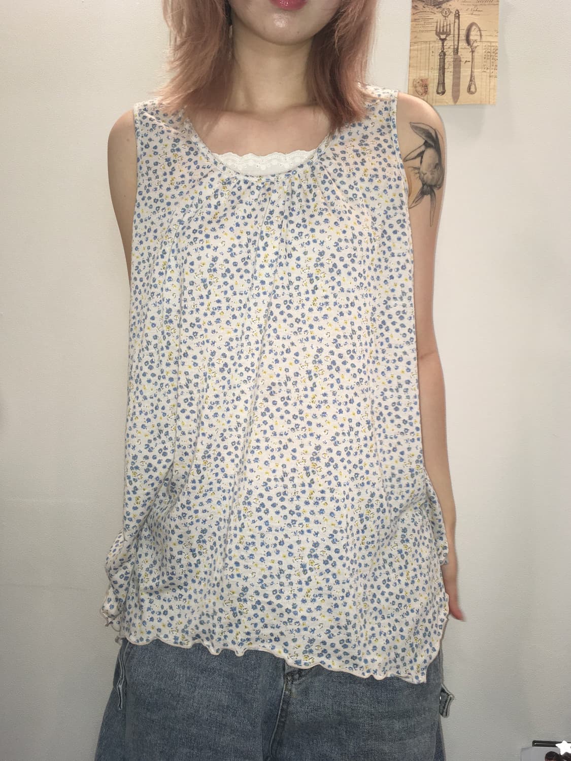 -jpn vintage 모리 잔꽃 레이스 슬리브리스 •Brand Yaniel •size 어깨 34 가슴 52 총장 63 •fabric 폴리100 🤍0363