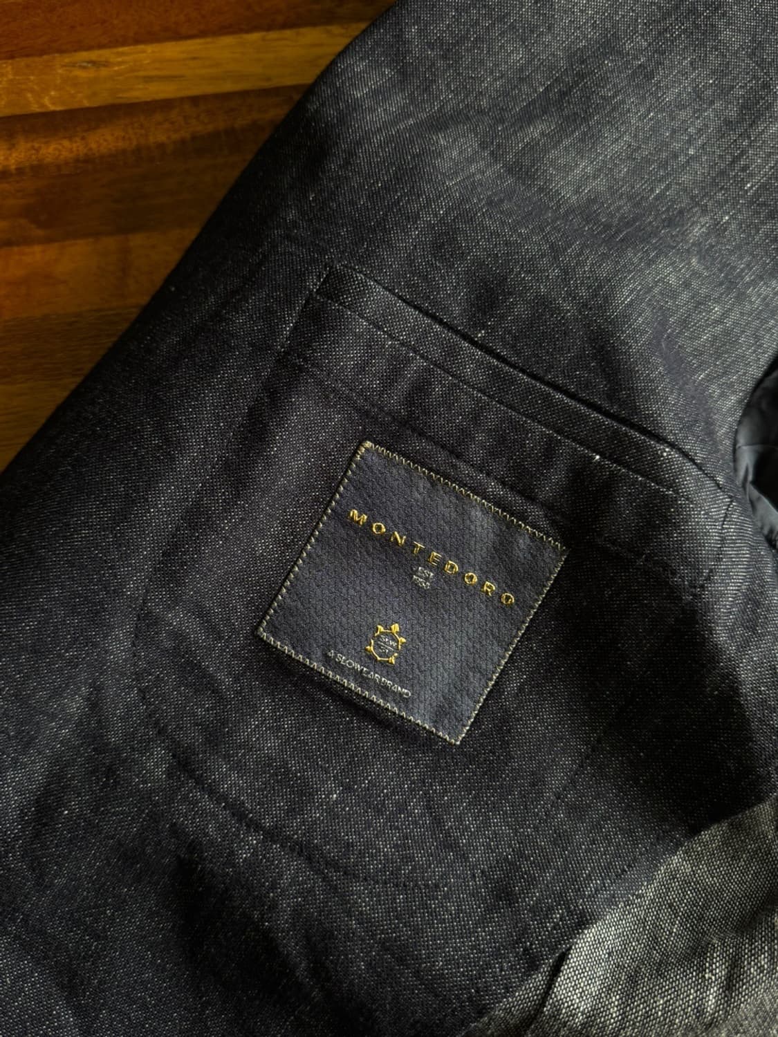 매 시즌 원단만 달리하여 출시되는 이탈리아 브랜드 몬테도로의 시그니처패턴으로 연출된 테일러드 자켓입니다. 탄탄한 저지패브릭에 데님의 농담을 입힌 이후 나폴리탄 테일러링을 거쳐 재단된 모델로 사이즈 이탈리아 52 국내 103 슬림 105 추천합니다. 감사합니다.