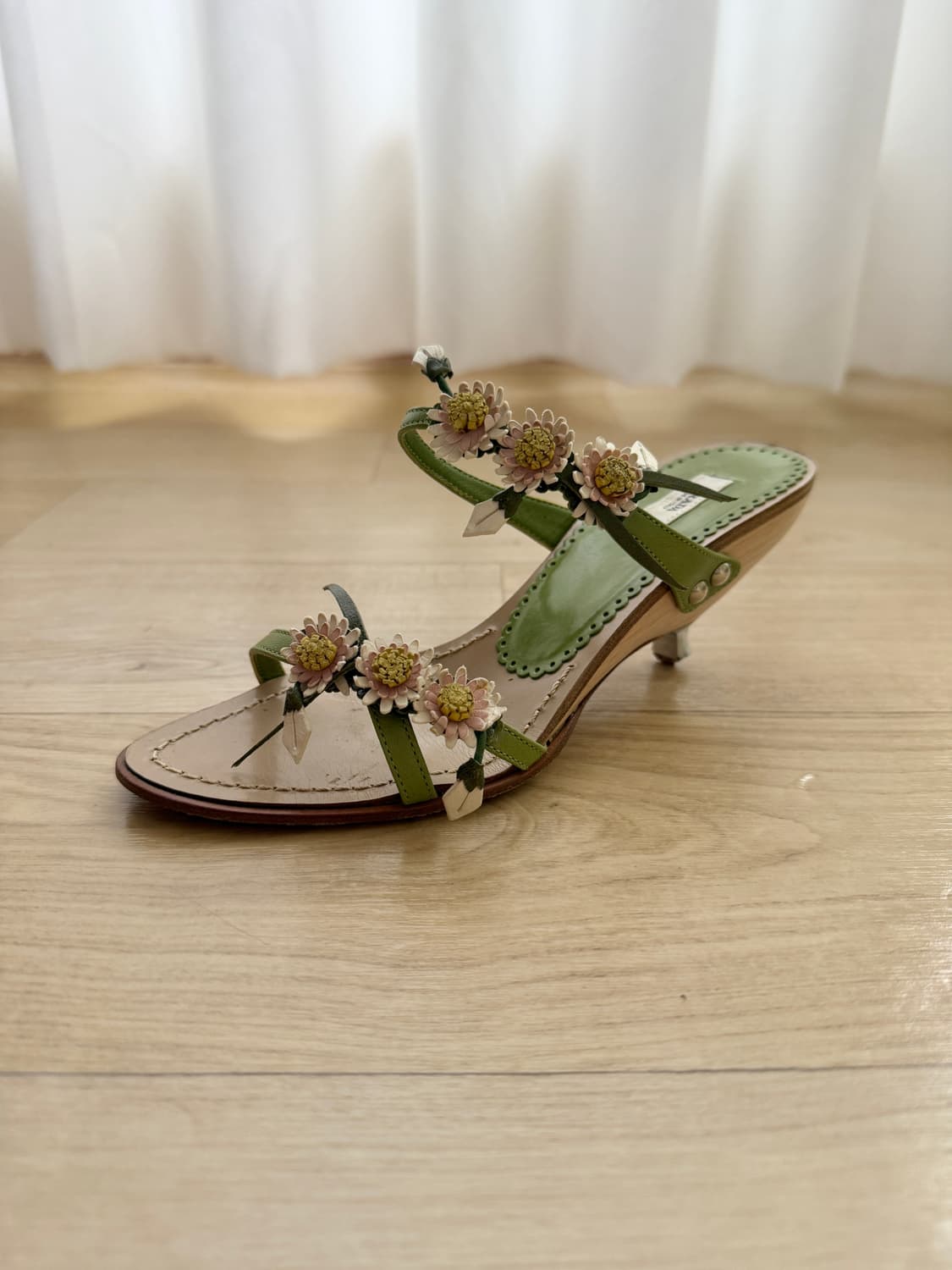 정교한 가죽 꽃 장식의 프라다 샌들 이건 신기가 아까워서 3-4회 정도 신은거 같아요. 항아리(?)같은 나무 웨지굽+ 끝부분 은색 금속 키튼힐 발볼도 편안하고 작품같은 슈즈입니다. 사이즈 34.5 이지만 230-235 신는 저에게 딱 예쁘게 맞습니다 5번사진 참조 (페디안한 발 양해해주세요… 🥲) * 굽 밑에 뎅까가 보관하면서 쪼개졌어요. 이유를 모르겠는데 이건 수선소에서 뎅까교체 또는 고무 덧댐 하시면 됩니다. 이 부분 제외하고는 거의 새제품 급입니다. 신발 단품 마지막 사진은 디자이너 브랜드 렌트/판매하는 해외 사이트 캡쳐분입니다.