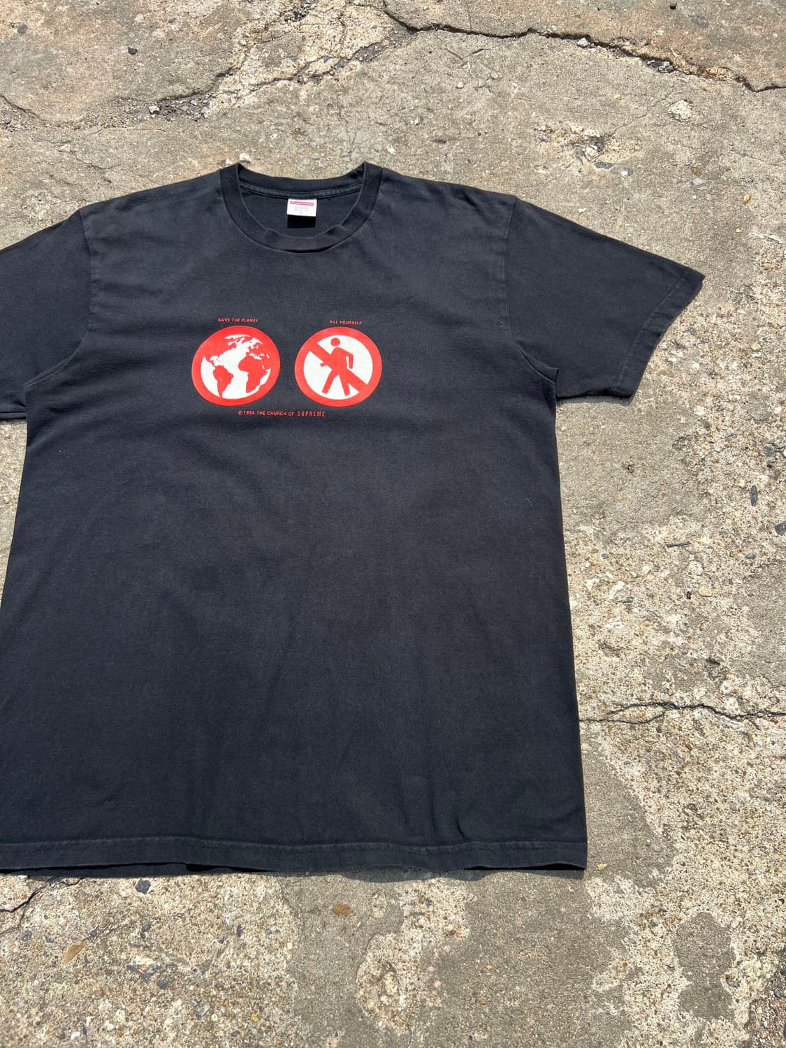 Made in usa 2019년에 발매된 슈프림티셔츠, 약간의 페이딩이 매력적인 개체이며, 특유의 텍스트와 아트워크가 돋보입니다. 표기 : LARGE 길이73.5 가슴단면58 어깨52 팔길이24