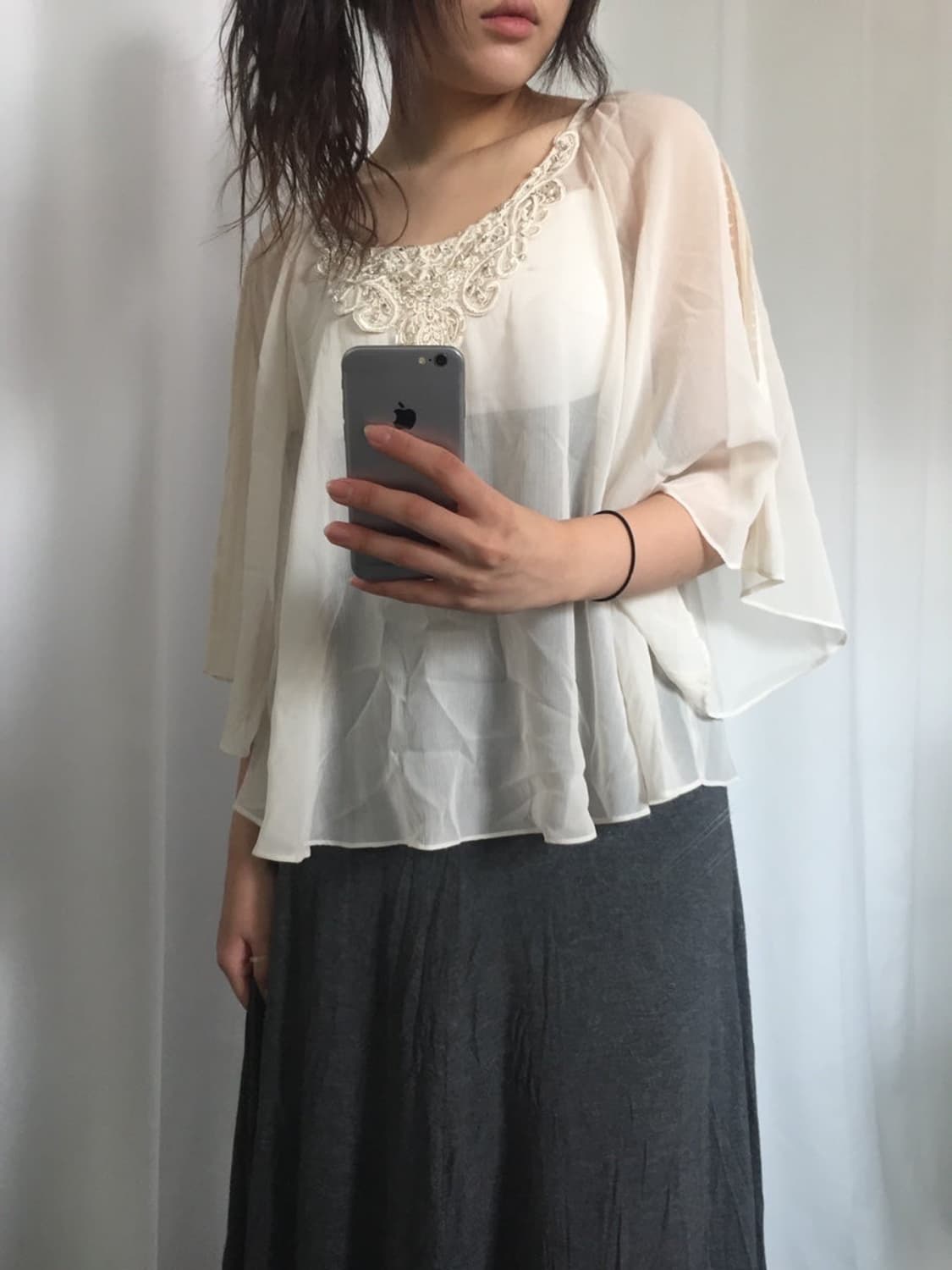 어깨 43 / 가슴 60 / 소매 43 / 총장 57 폴리에스테르100% -와이드한 가오리 핏 -시스루 소재 -페미닌 무드 -레이스 큐빅 포인트 -컨디션 8/10 모델 사이즈 •163 / 55 size ( 하체 발달형 ) @goul.vint