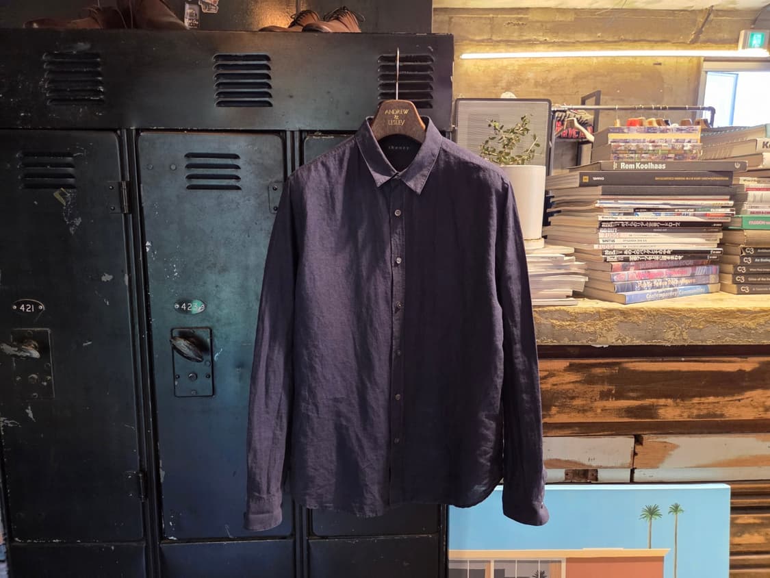 서걱거리며 시원함을 남긴 린넨의 풍성한 질감에 탁성을 띈 네이비색감으로 띠어리의 고유함을 드러낸 한장입니다. 사이즈 국내 100 권합니다. 감사합니다