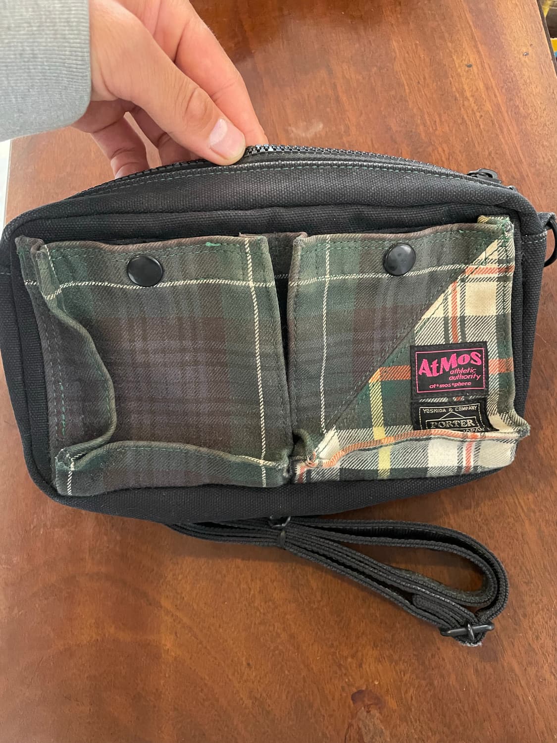 -색상: 블랙&체크 -가로: 25cm -세로: 16cm 약간의 오차가 있을 수 있습니다. 일본에서 유명한 편집샵 ATMOS와 콜라보한 모델로 흔치 않은 디자인 포터 가방입니다.